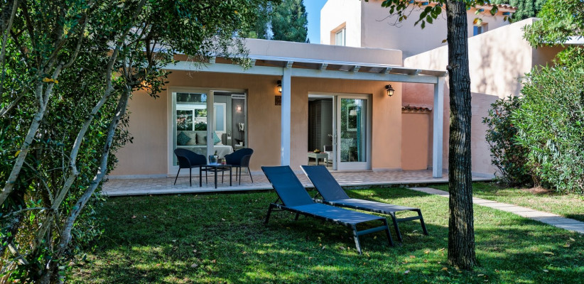 35 м2, частный сад, внутренний двор. Спальня с двуспальной кроватью, гостиная с диваном или двумя раскладными кроватями, ванная комната с душем и ванной. Максимальное количество гостей: 2 взрослых и 2 ребенка.Deluxe Bungalow