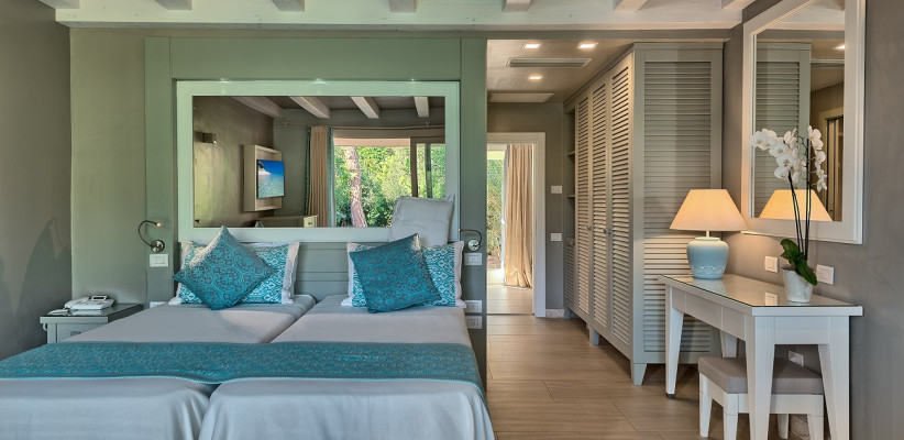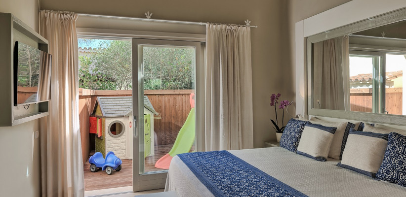44–49 м2, два внутренних двора с двумя отдельными входами. Две смежные спальни: в одной – двуспальная кровать или две односпальные кровати, ванная комната с ванной и душем, в другой – две односпальные кровати и ванная комната с душем. Возможно размещение дополнительной кровати. Максимальное количество гостей: 2 взрослых и 3 ребенка.Deluxe Family Bungalow