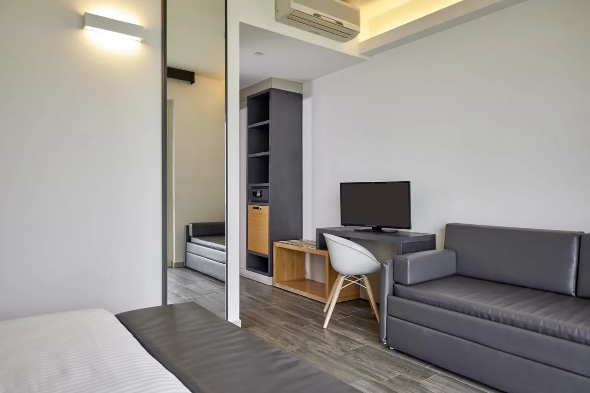 40-50 м2, двуспальная кровать или две односпальные кровати, диван, гостиная зона, рабочая зона. Количество гостей: 2.