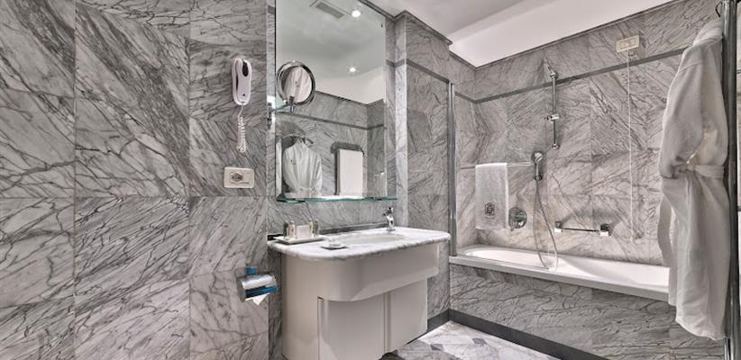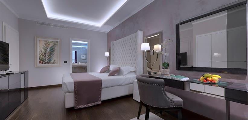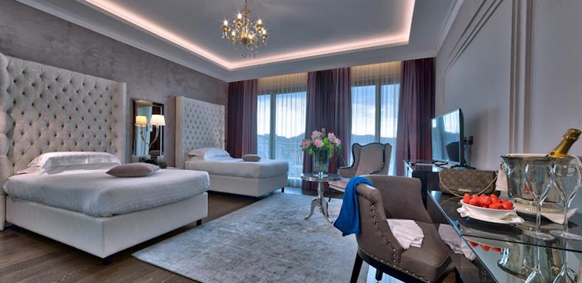 Panoramic Room площадью 35-38 кв. м., с двухспальной кроватью, мраморная ванная комната с большой душевой кабиной, гостиная с диваном, с видом на холмы или город.