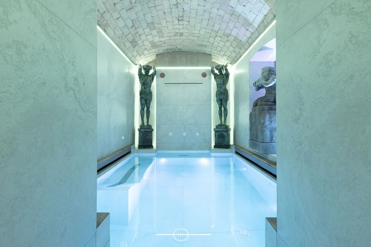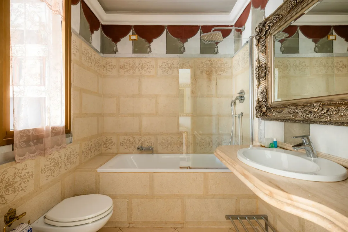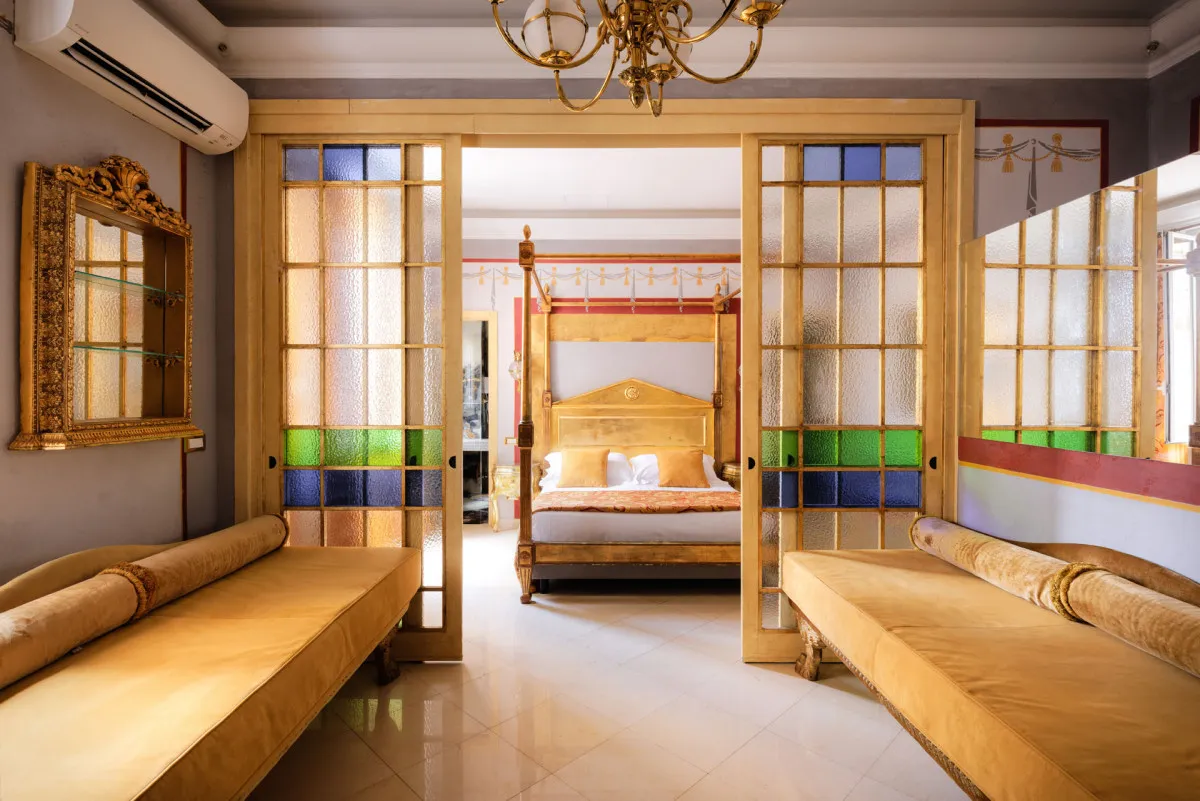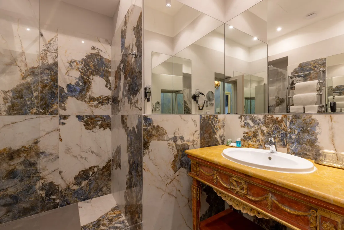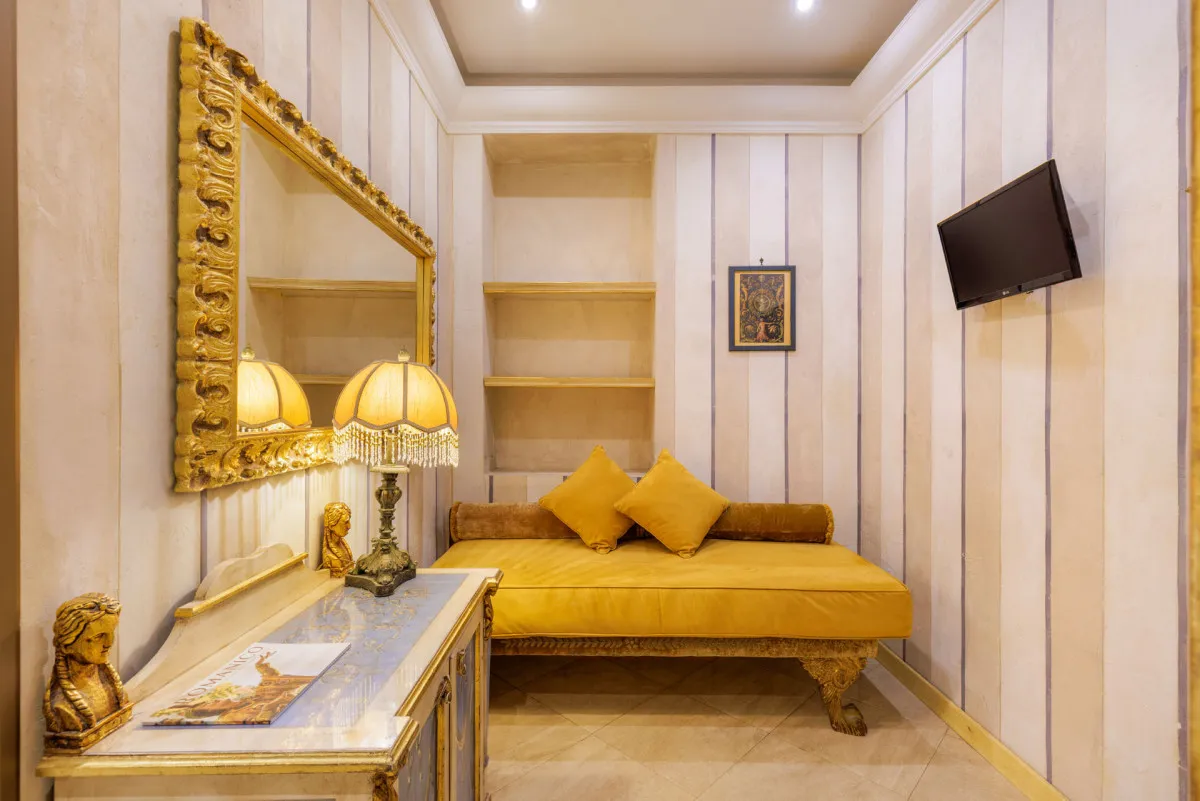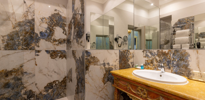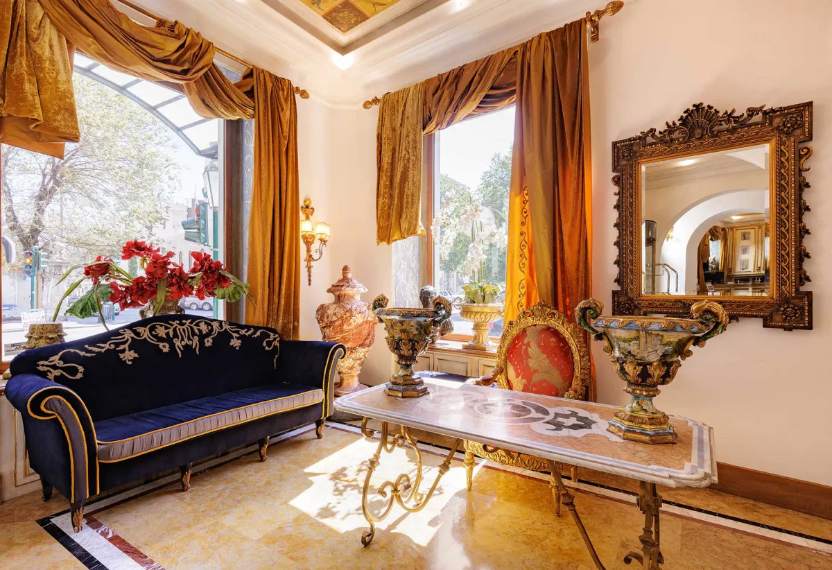 - Напоминает музей благодаря особенностям архитектуры и интерьера: антикварная мебель в номерах, итальянский мрамор в ванных комнатах, фрески, резные деревянные панели, изысканные предметы декора ручной работы.