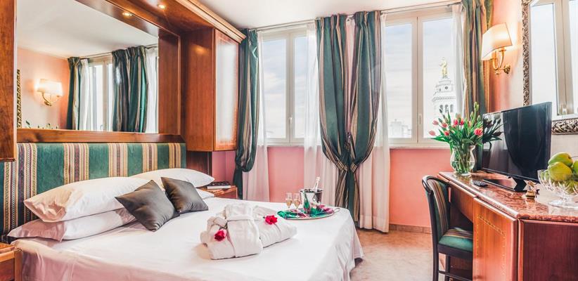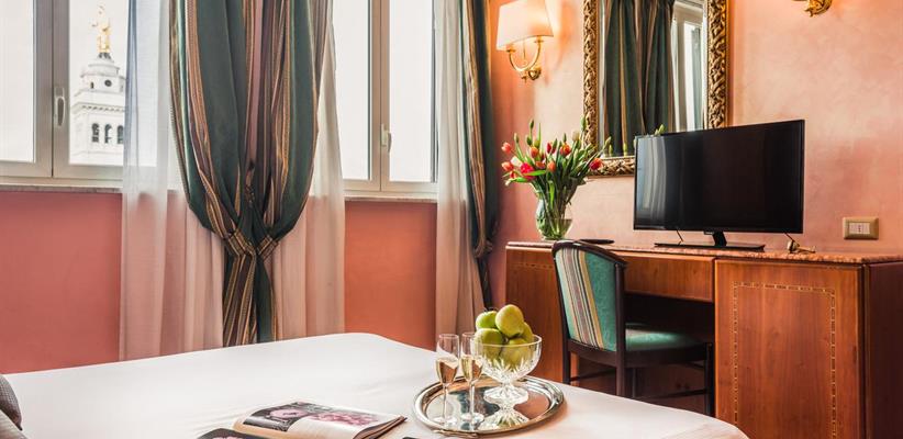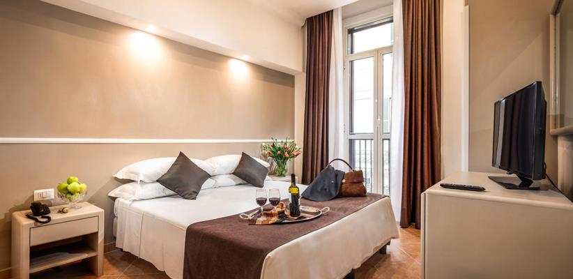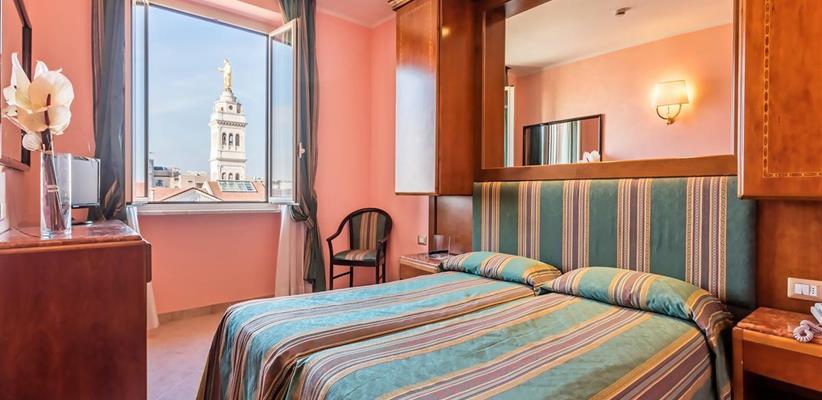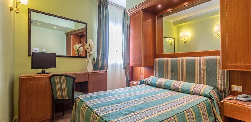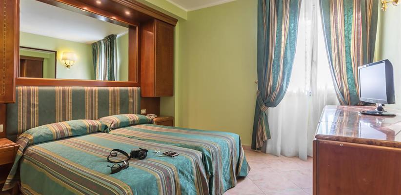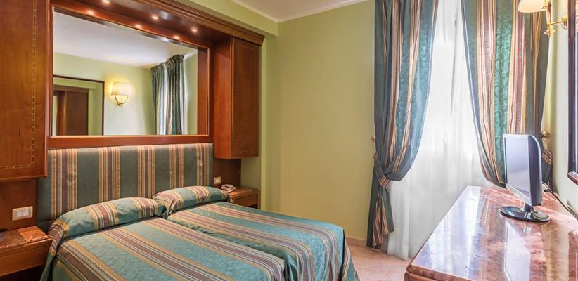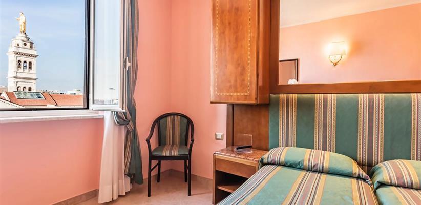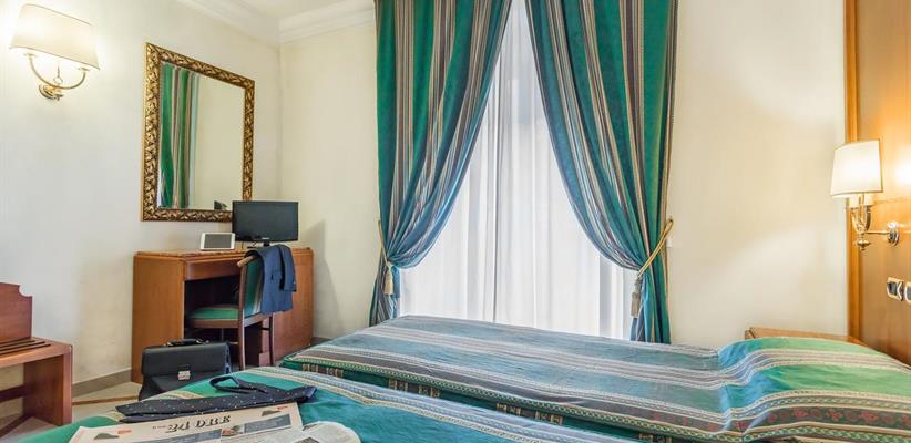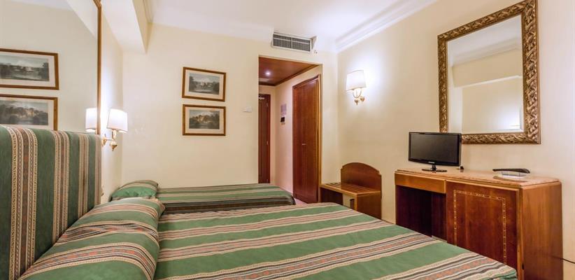 Зону для сна образуют расположенные рядом односпальные кровати. Здесь приятно отдохнуть в ночные часы, когда одаривающий впечатлениями Рим ненадолго отпускает туриста взять небольшую передышку перед следующим, насыщенным событиями, днем. В комнатах есть все необходимое для того, чтобы не задумываться о проблемах проживания вдали от дома: кондиционеры, телевизоры, мини-бары, фены. За сохранность сбережений отвечает бесплатный электронный сейф в каждом номере. А ежедневный бодрящий душ в удобной ванной становится неиссякаемым источником энергии, тем более что все необходимые туалетные и косметические принадлежности имеются.
