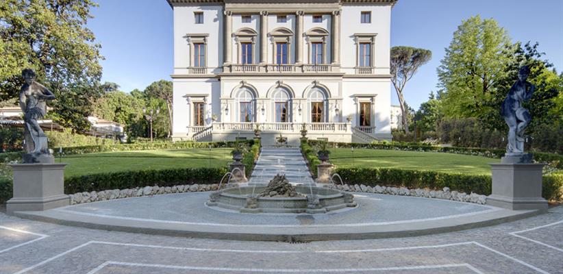 Villa Cora, отделанная материалами, такими как каррарский мрамор, желтый сиенский мрамор, муранское стекло, черное дерево и шелк от знаменитой фабрики Freres Braquenie D'Aubusson, излучает атмосферу непреходящего очарования.