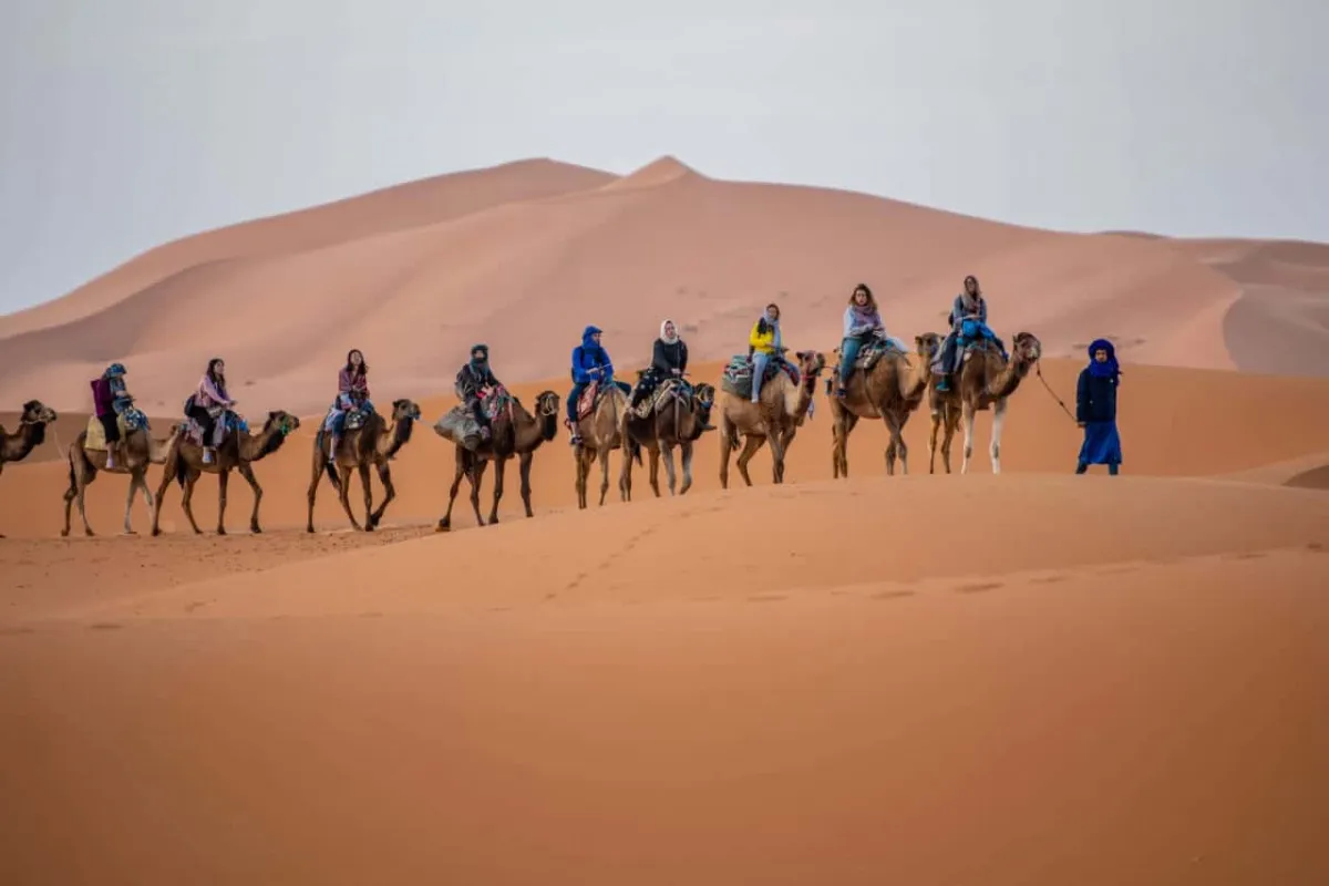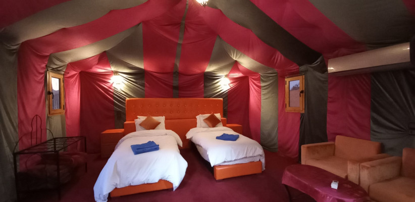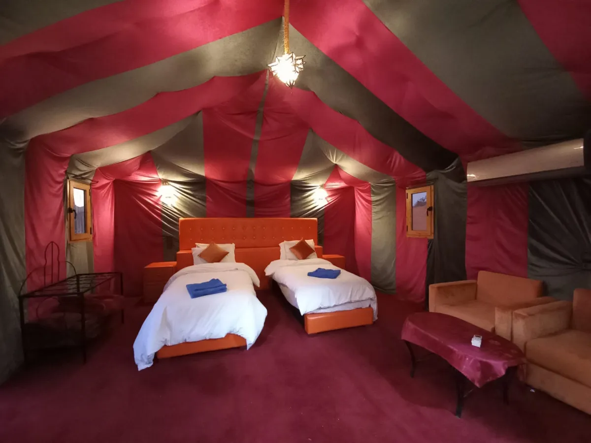 - Лагерь находится в окружении живописных скал и дюн, которые меняют цвет от нежно-розового до ярко-оранжевого в зависимости от времени суток.