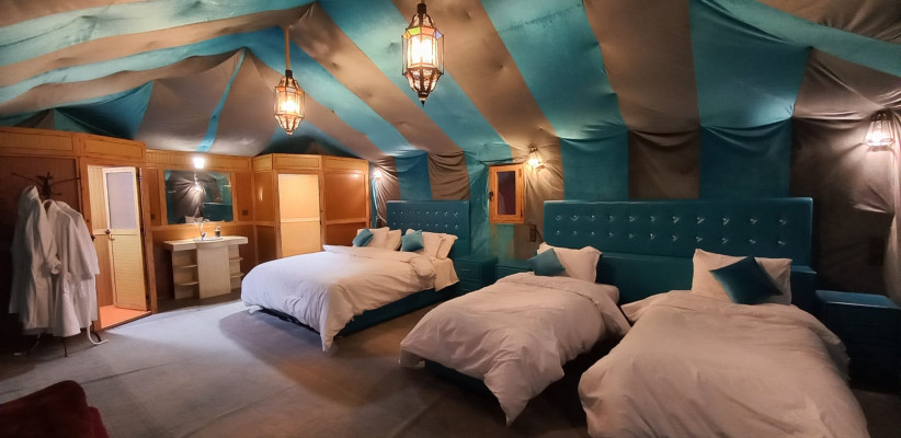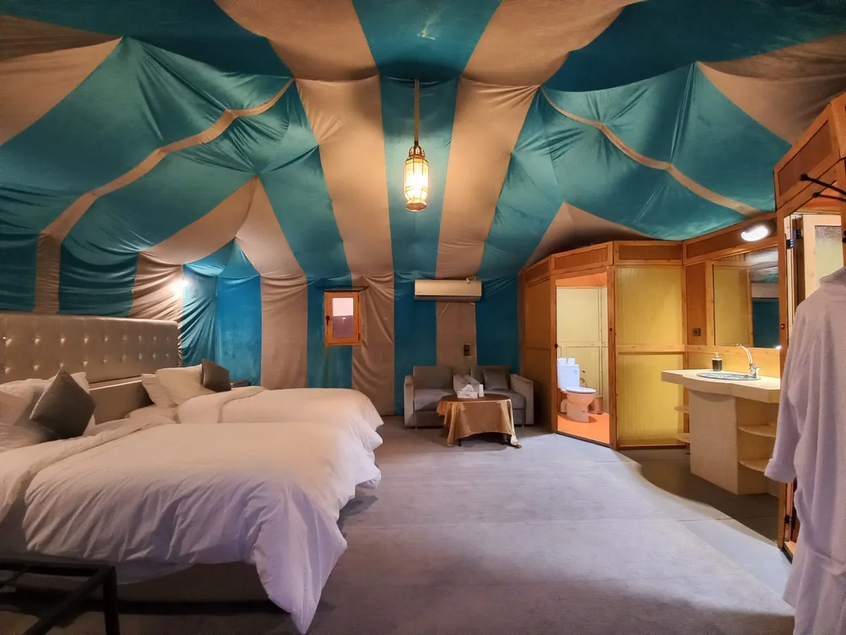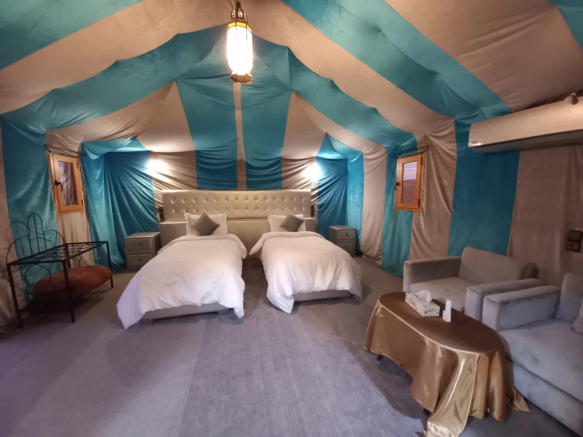 Yasmina Luxury Camp – это изысканный и уютный глэмпинг-отель, который гармонично вписан в инопланетные ландшафты заповедника Вади-Рам. Лагерь представляет собой воплощение современного комфорта, позволяя туристам прикоснуться к магии пустыни, не отказываясь от удобств премиального уровня. Расположенный в районе Дисси, кемпинг окружен монументальными скалами и бескрайними рыжими песками, что создает ощущение полной изоляции от внешнего мира. Архитектура лагеря спроектирована так, чтобы минимизировать вмешательство в природную красоту. Фонд лагеря включает 35 элегантных номеров, выполненных в стиле высокотехнологичных шатров и панорамных «пузырей». Интерьеры Yasmina Luxury Camp сочетают в себе современную функциональность и аутентичные арабские мотивы.