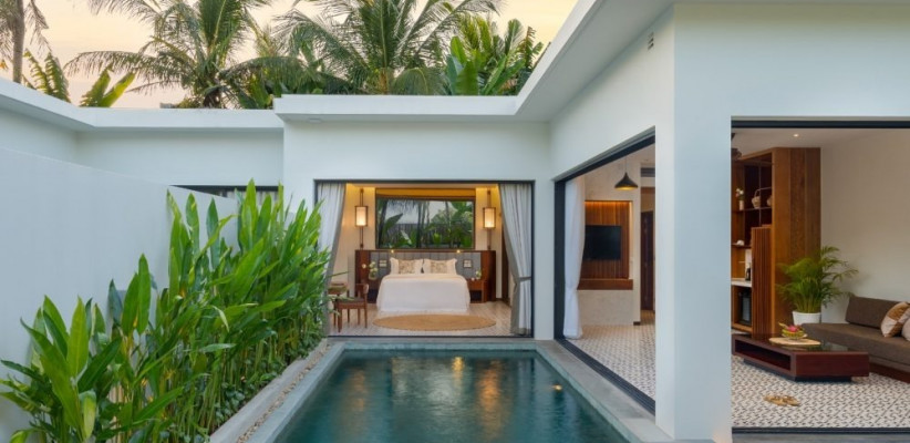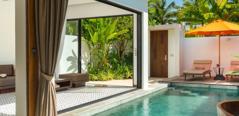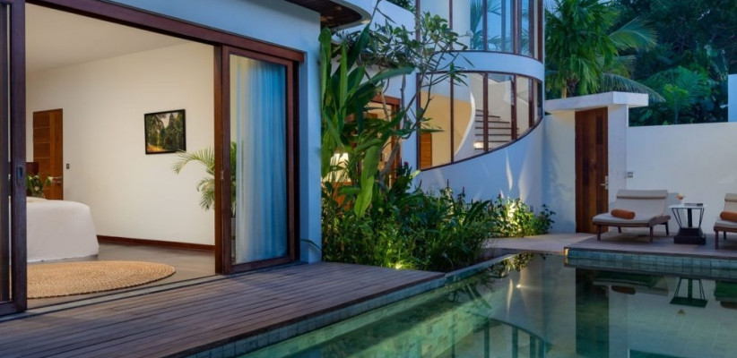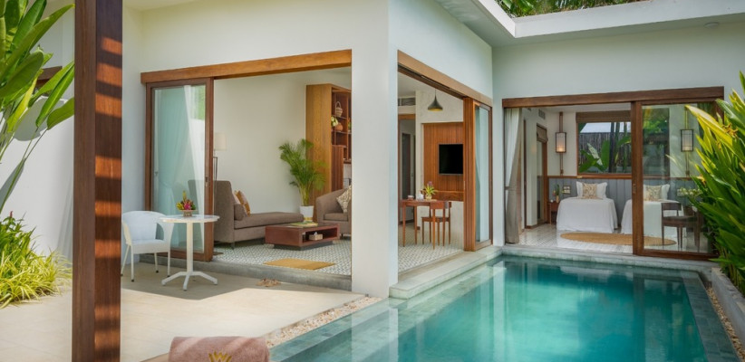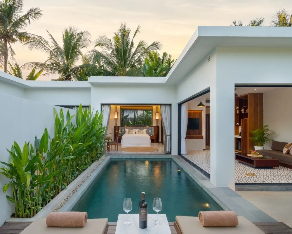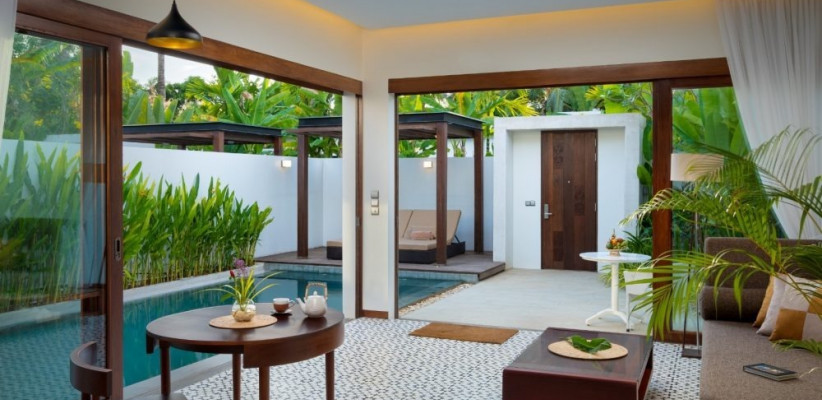 128 м2, мебелированная терраса, спальня с двуспальной кроватью размера king-size, гостиная зона, мини-кухня, обеденная зона, частный бассейн. Максимальное количество гостей: 2.Deluxe Villa One Bedroom