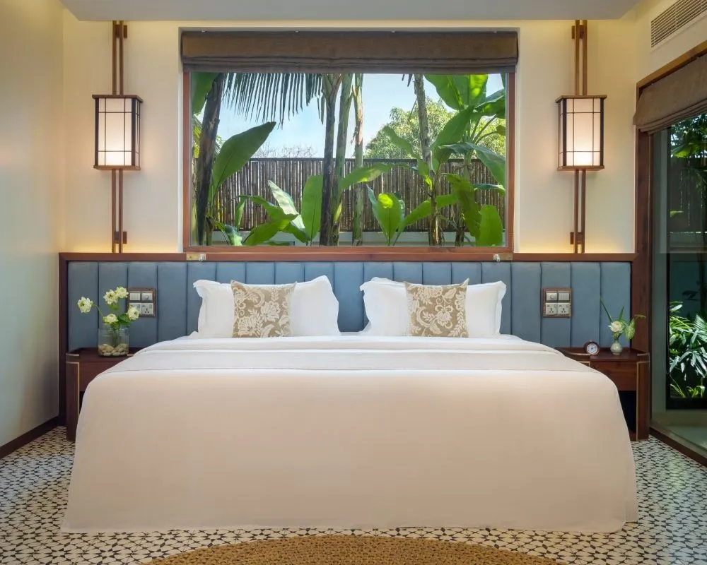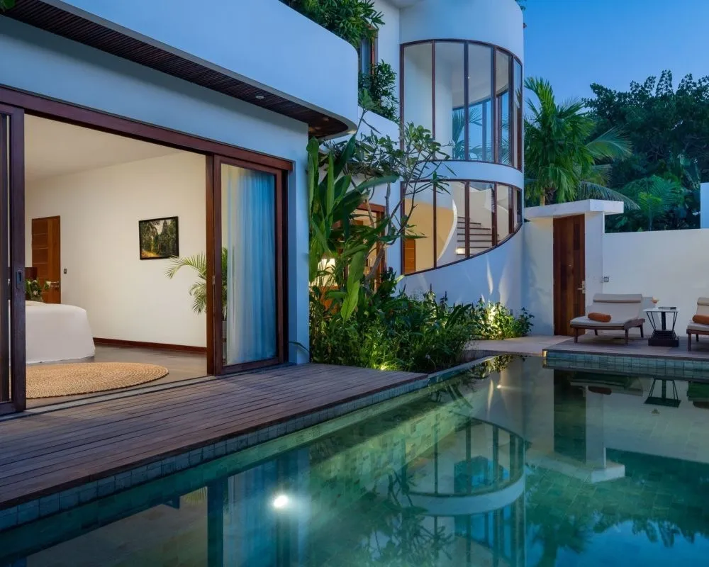 161 м2, мебелированная терраса, спальня с двуспальной кроватью размера king-size, просторная гостиная, обеденная зона, ванная с видом на сад, бассейн. Максимальное количество гостей: 2.Deluxe Villa Three Bedrooms