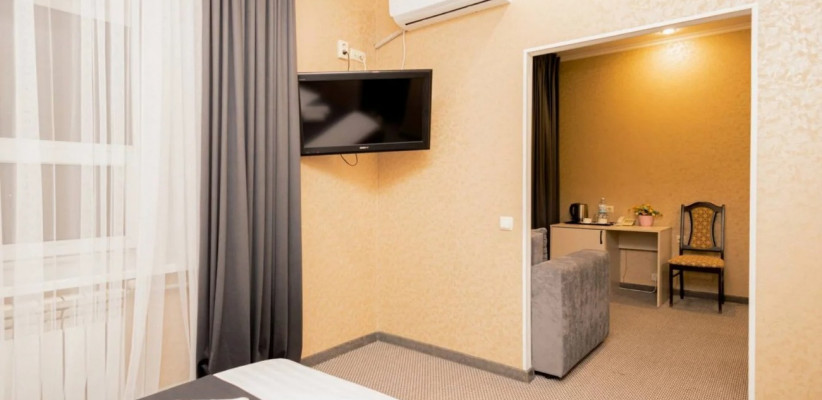 спальня с двуспальной кроватью, гостиная зона с креслом, обеденная зона. Максимальное количество гостей: 2.Люкс