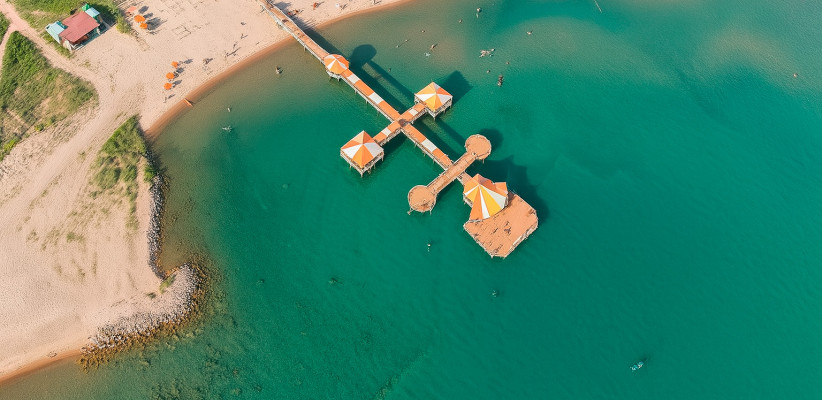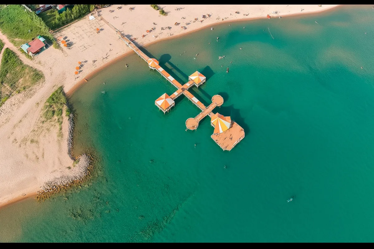 Песчаный, оборудованы пирс, шезлонги и зоны отдыха.