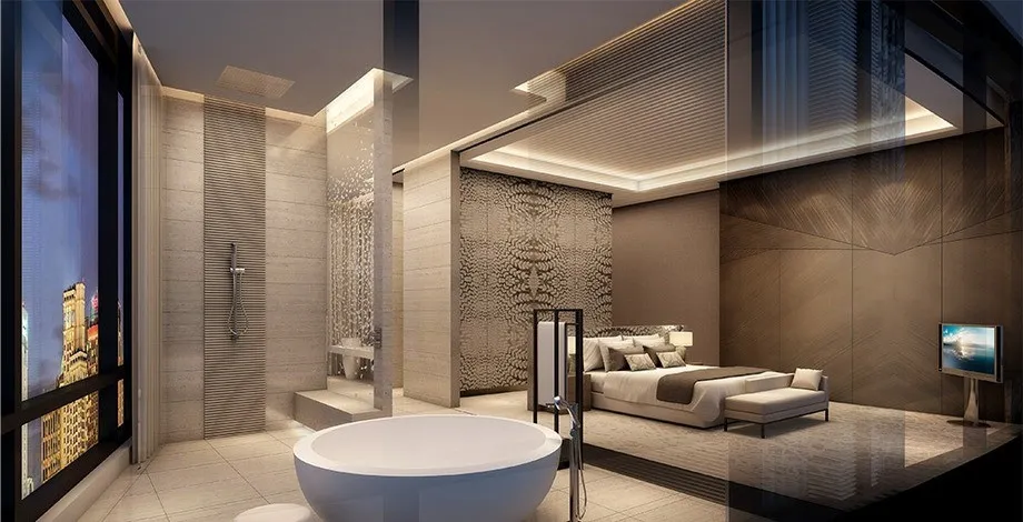 - Номерной фонд состоит из 55 апартаментов и люксов. Каждый номер оборудован просторной ванной комнатой или частным бассейном и панорамными окнами с видом на ключевые городские объекты.
