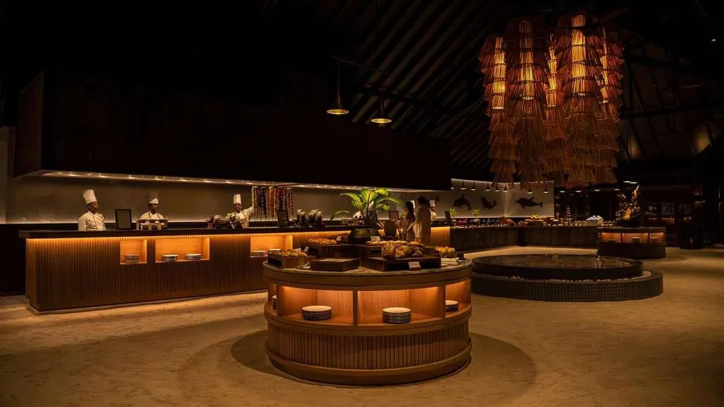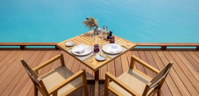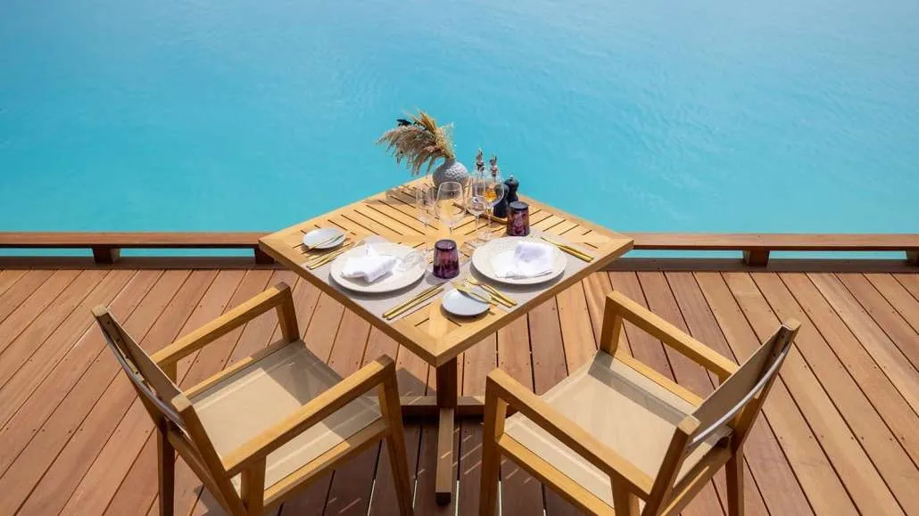 - Номерной фонд насчитывает 80 вилл, включая надводные и береговые категории. Надводные виллы дополнены террасами с видом на лагуну, тогда как береговые виллы обеспечивают прямой выход к пляжу и располагают приватными зонами отдыха.