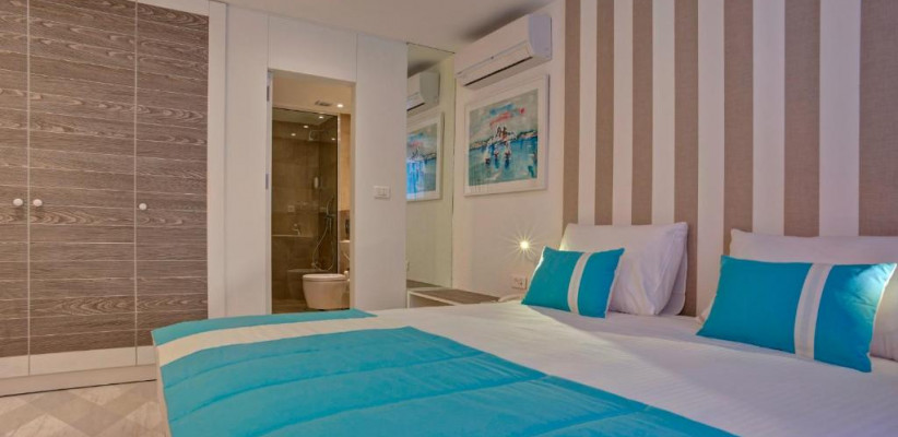 43 м2, апартаменты с видом на море, двуспальной кроватью, диваном-кроватью, оборудованной кухней с обеденной зоной, гостиной, ванной комнатой.