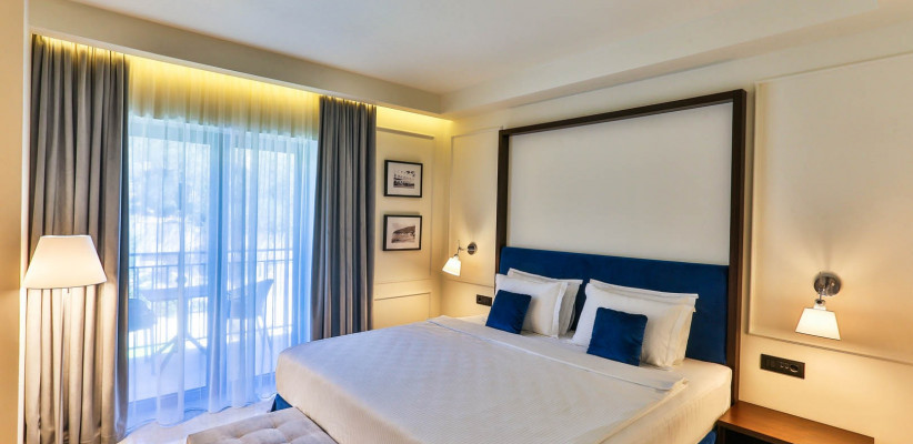 28 м2, французский балкон с видом на море. Две кровати queen-size. Максимальное количество гостей: 4.Deluxe Suite with Sea View