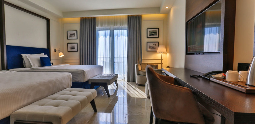 28 м2, французский балкон с видом на горы. Две кровати queen-size. Максимальное количество гостей: 4.Family Room with Sea View