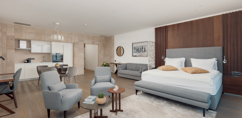 52 м2, номер с видом на сад, зоной отдыха, полностью одорубованной кухней, рабочей зоной и душем в ванной комнате. Максимальное количество гостей: 2.Lux Suite Sea View
