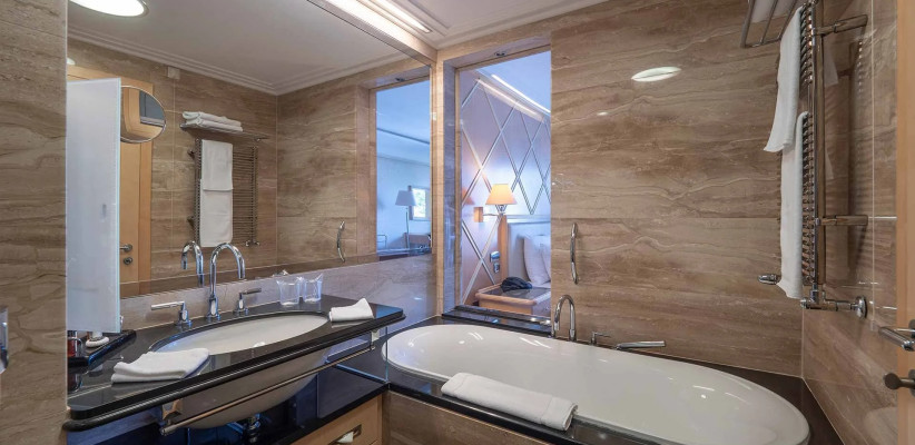 84 м2 с меблированной террасой. В номере: спальня с кроватью king-size, телевизор, диван, гостиная, гардеробная, письменный стол, ванная комната с джакузи. Максимальное количество гостей: 3 взрослых и 3 ребенка.Wellness Suites