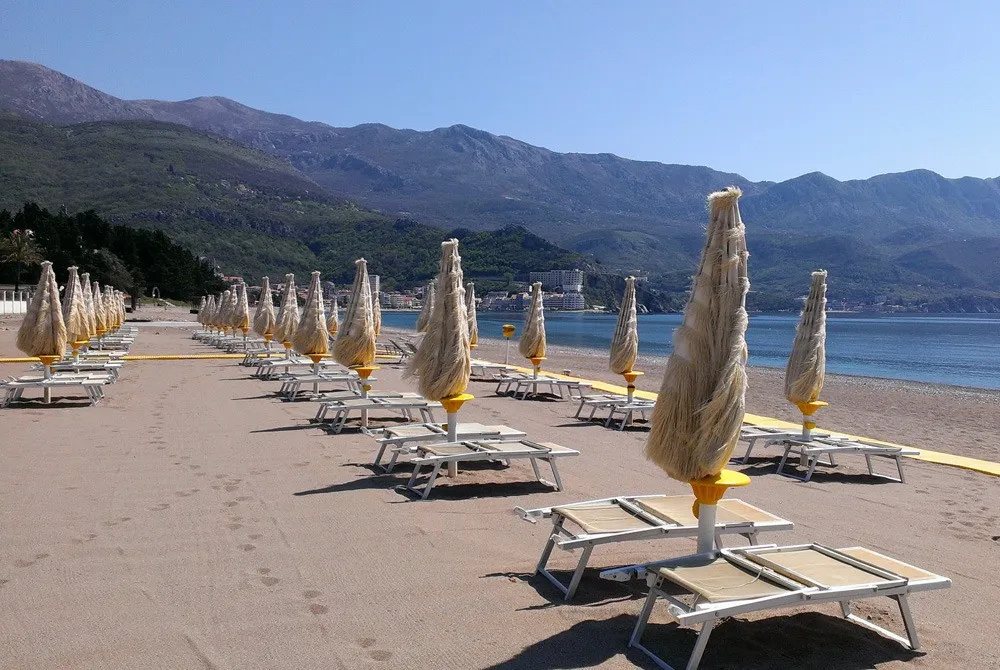 Частный песчаный пляж с шезлонгами и солнцезащитными зонтами.