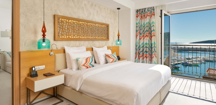 - Просторные номера с видом на море или марину, современные удобства, балконы, полностью оборудованные кухни (в апартаментах) и лаконичный, но премиальный стиль оформления.