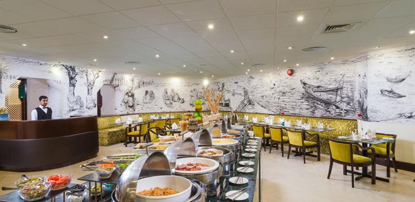 На территории отеля работает ресторан с арабской и интернациональной кухней в формате «шведский стол» или по меню, бар.