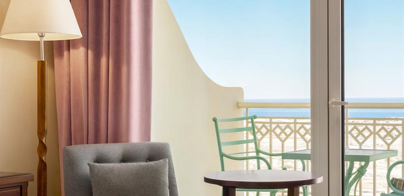 номер для людей с ограниченными физическими возможностями с балконом и видом на море. В номере: две односпальные кровати, рабочий стол, ванная комната с душем с поручнями и биде. Доступны смежные номера.