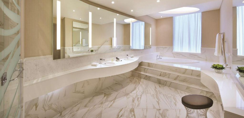 70 м2, номер с кроватью king-size, ванная комната с джакузи и тропическим душем, зона отдыха.Diplomatic Suite with Sea and Skyline View