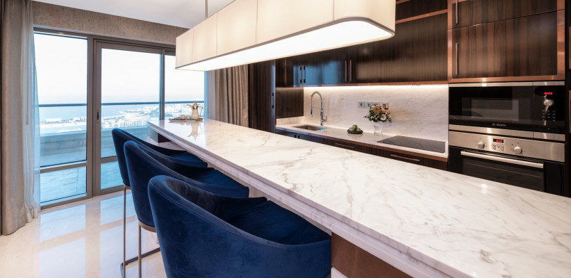 122–140 м2, три балкона с видом на курорт и море, кровать king-size и две кровати queen-size в двух спальнях, две ванные комнаты, гостиная со столовой зоной и кухней. Максимальное количество гостей: 6.