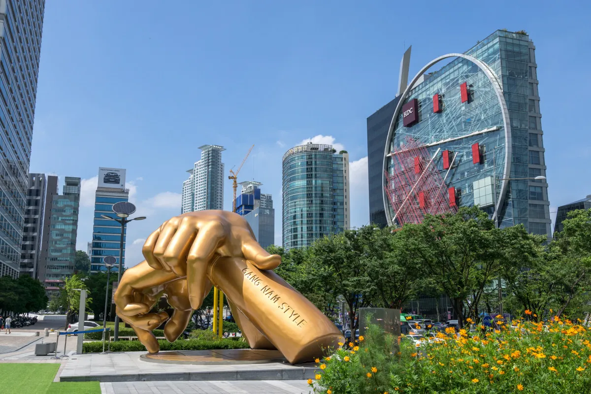 Памятник Gangnam Style находится в районе Каннам в Сеуле, недалеко от торгового центра COEX. Он представляет собой большие золотые руки, сложенные в знаменитом танцевальном движении из клипа Psy. Этот памятник создан в честь мировой популярности песни Gangnam Style и стал одним из символов современной корейской поп-культуры, куда туристы любят приходить, чтобы сделать фото и попробовать повторить танец.