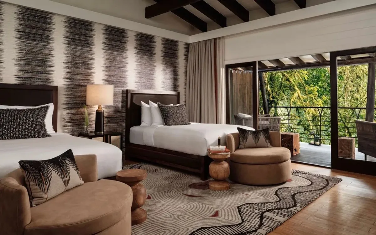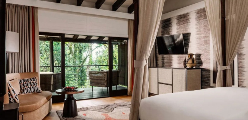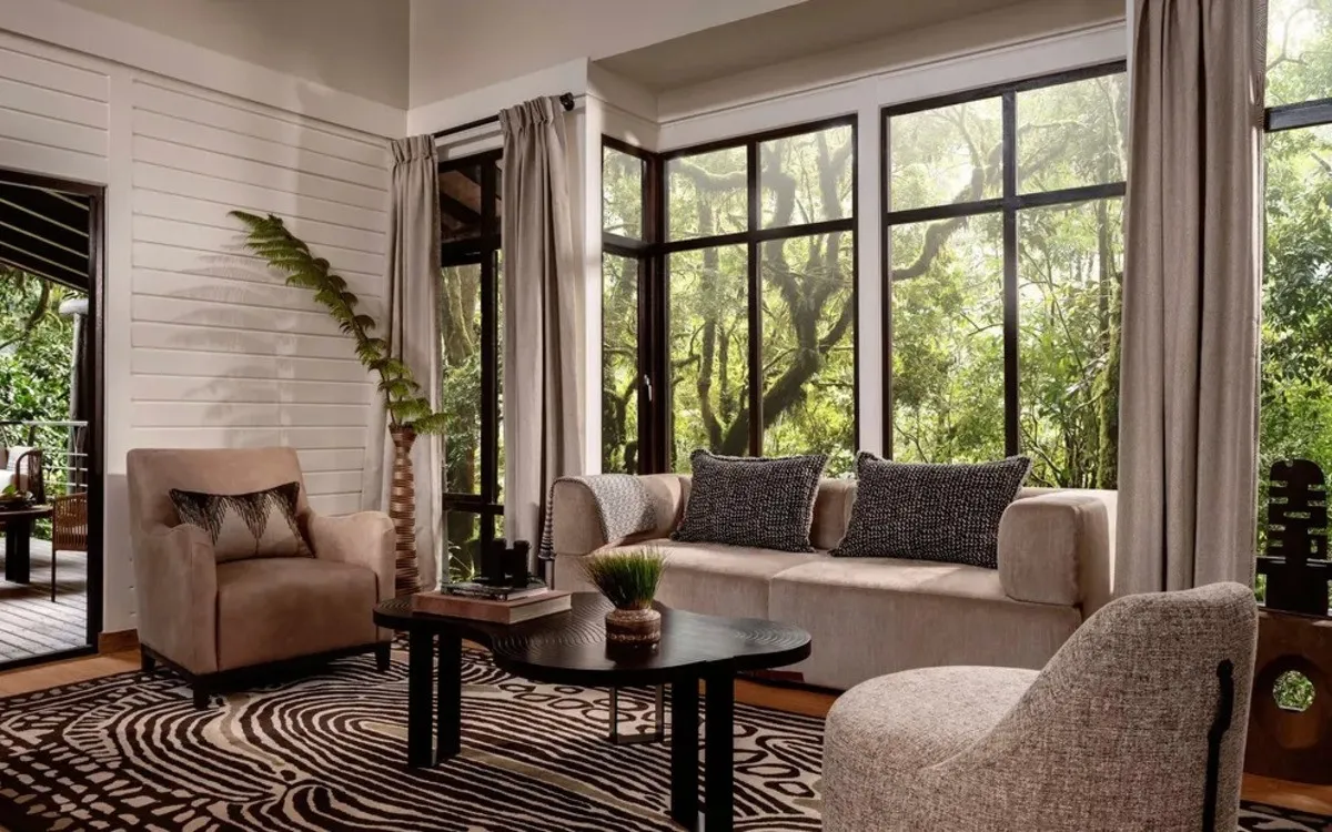 - Просторные номера и люксы с панорамными окнами и террасами над джунглями, уютными каминами и современными удобствами создают ощущение комфорта и уединения.
