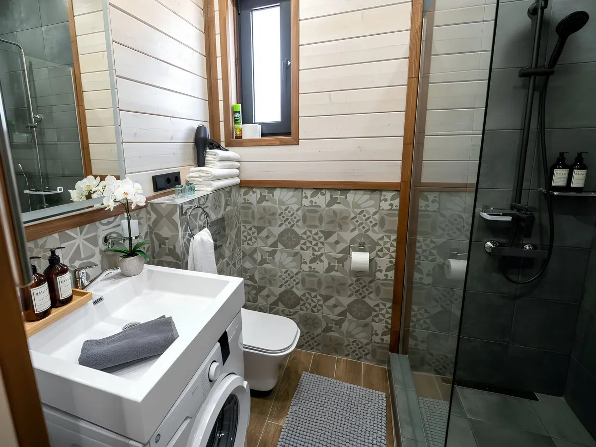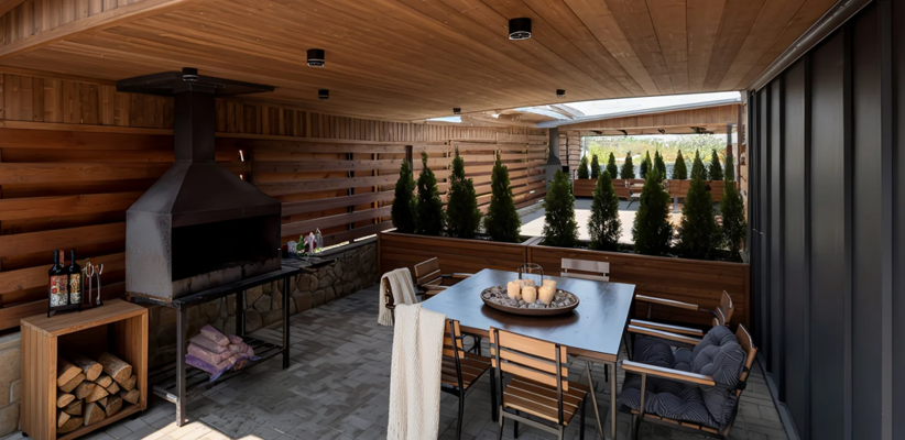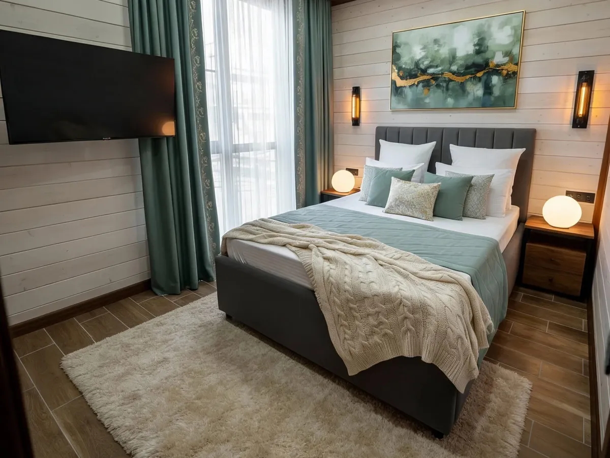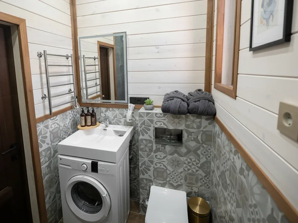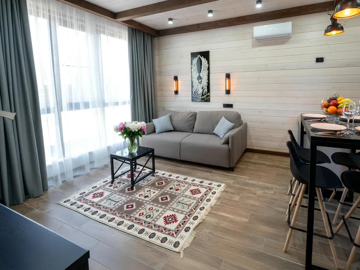 90 м2, 2 изолированные комнаты, 2 кровати (160×200 см), раскладной диван, гостиная с панорамными окнами, кухня-столовая, собственный участок с террасой и зоной барбекю. Количество гостей: до 6