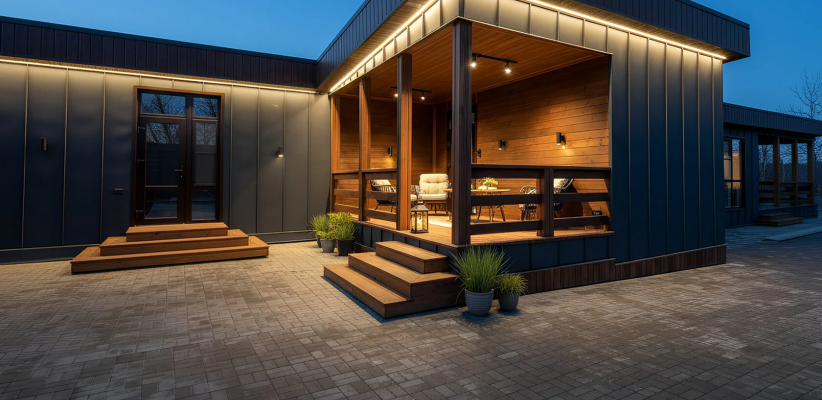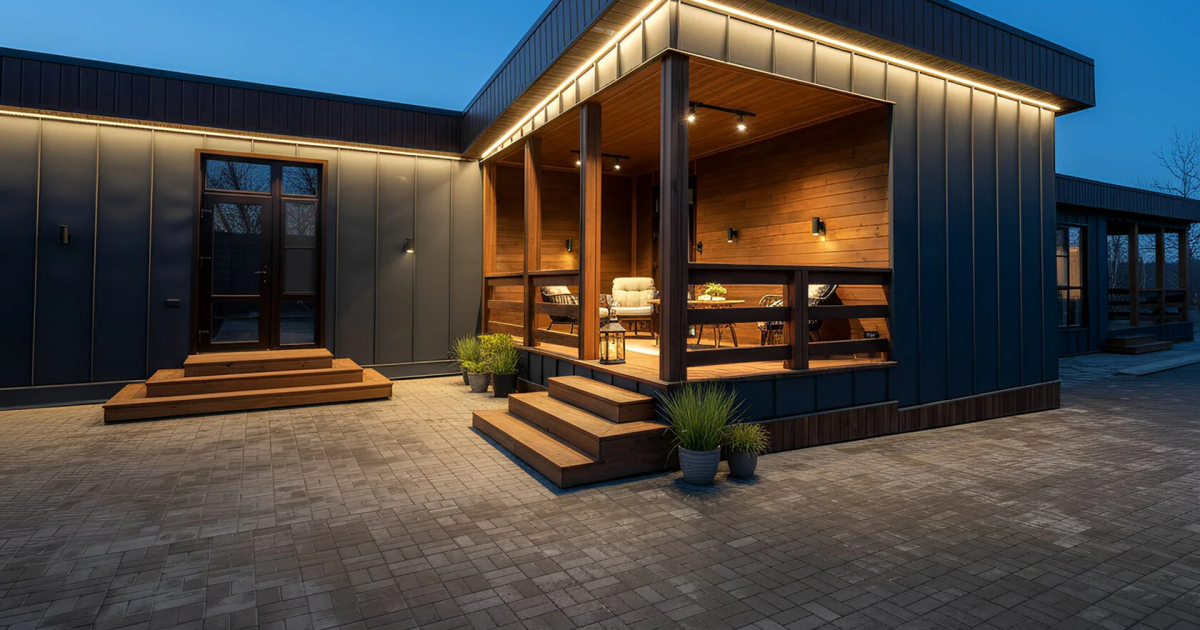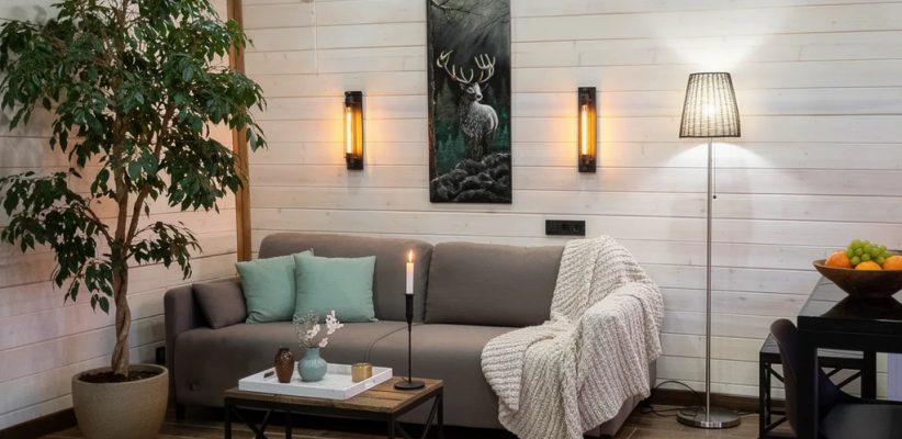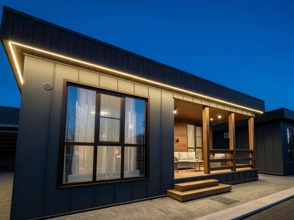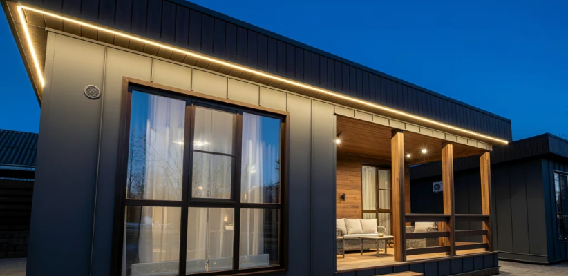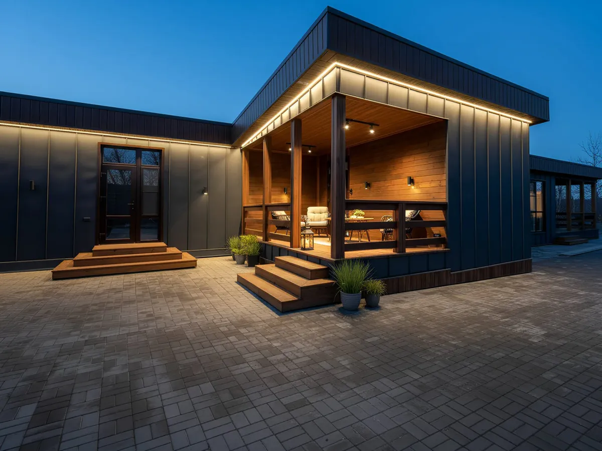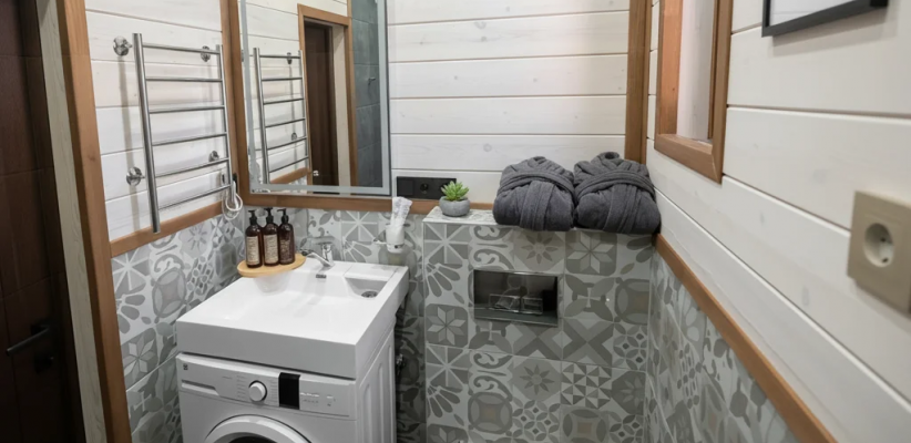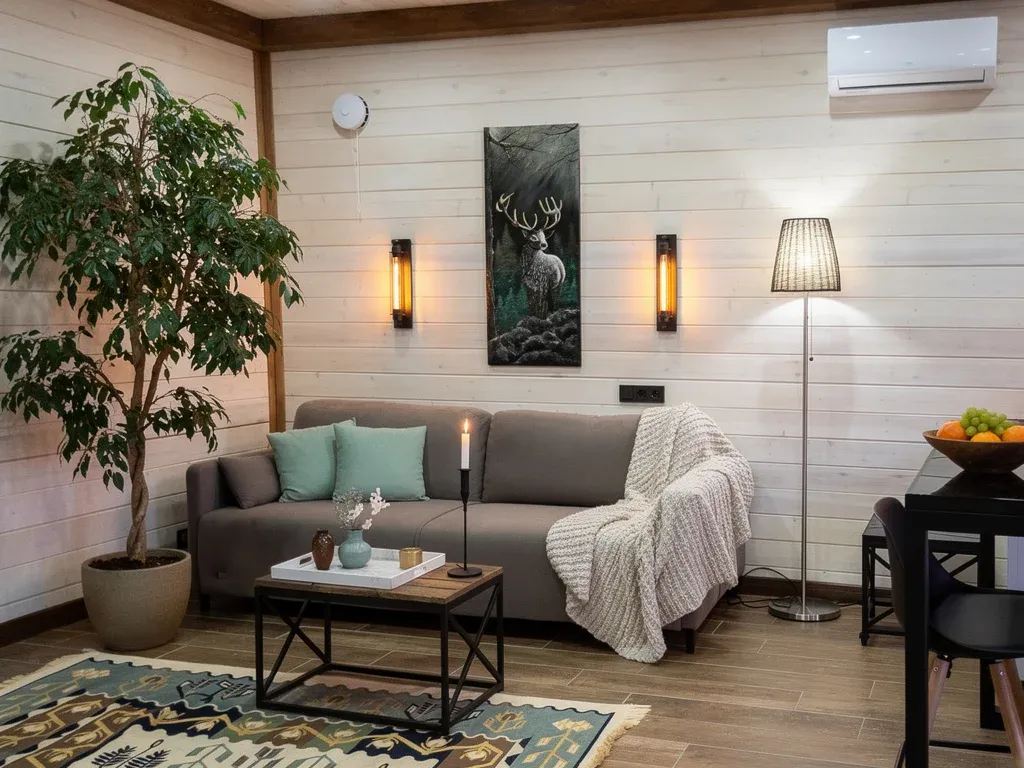 90 м2, 2 изолированные комнаты, 2 кровати (160×200 см), раскладной диван, гостиная с панорамными окнами, кухня-столовая, собственный участок с террасой и зоной барбекю. Количество гостей: до 6