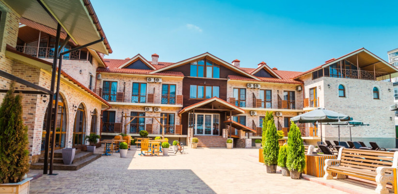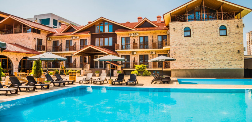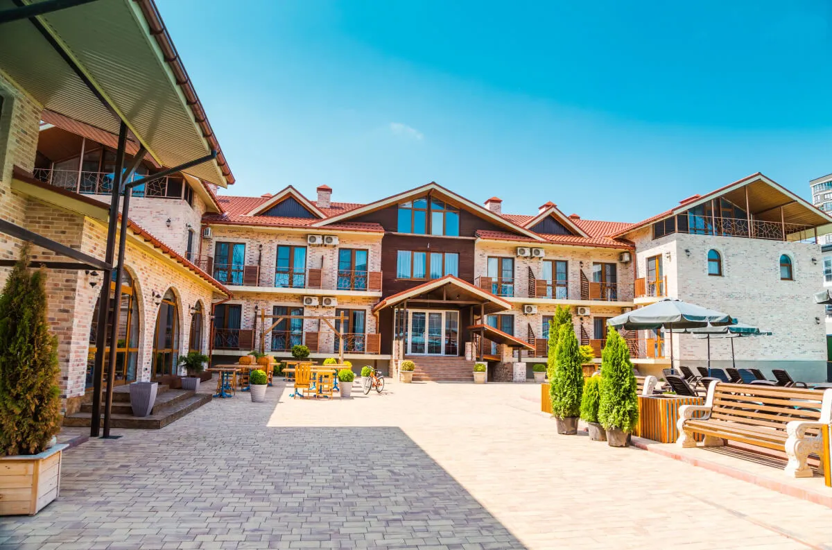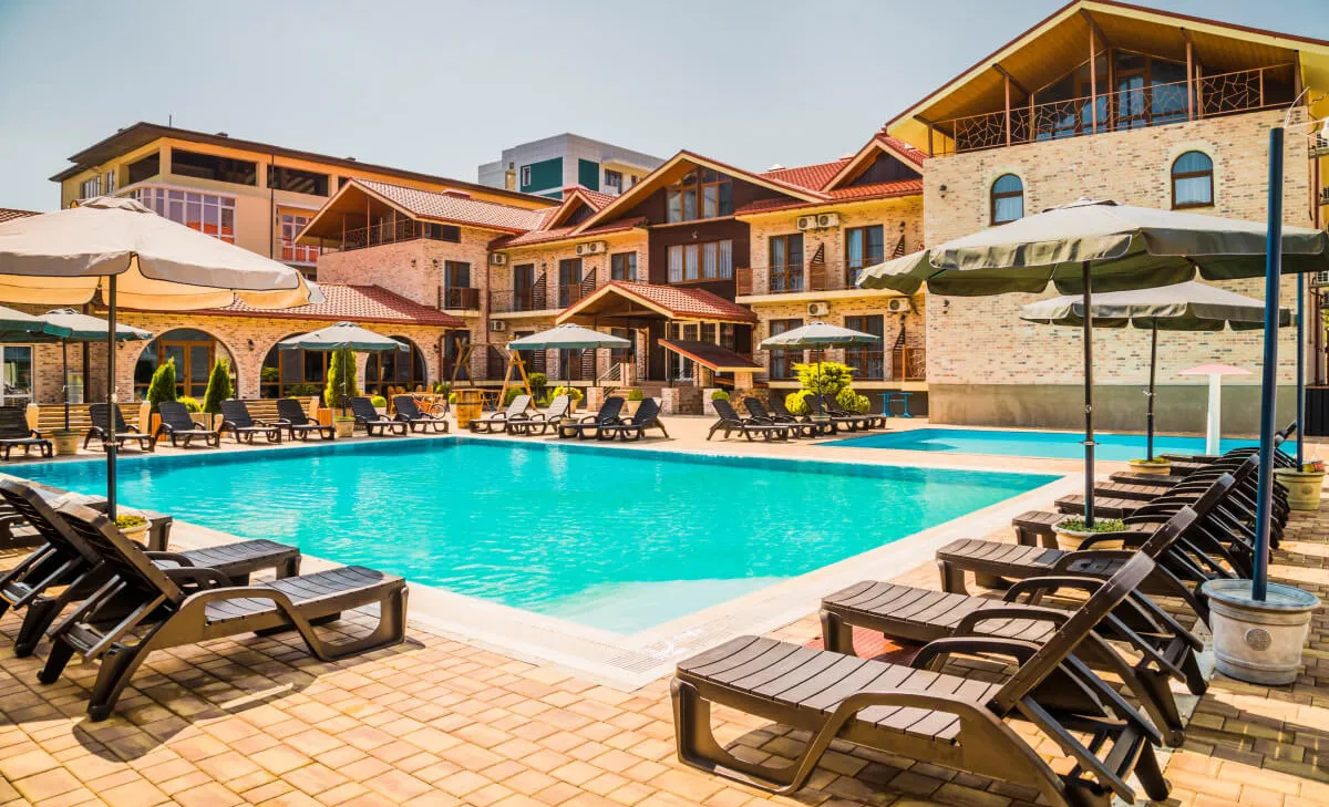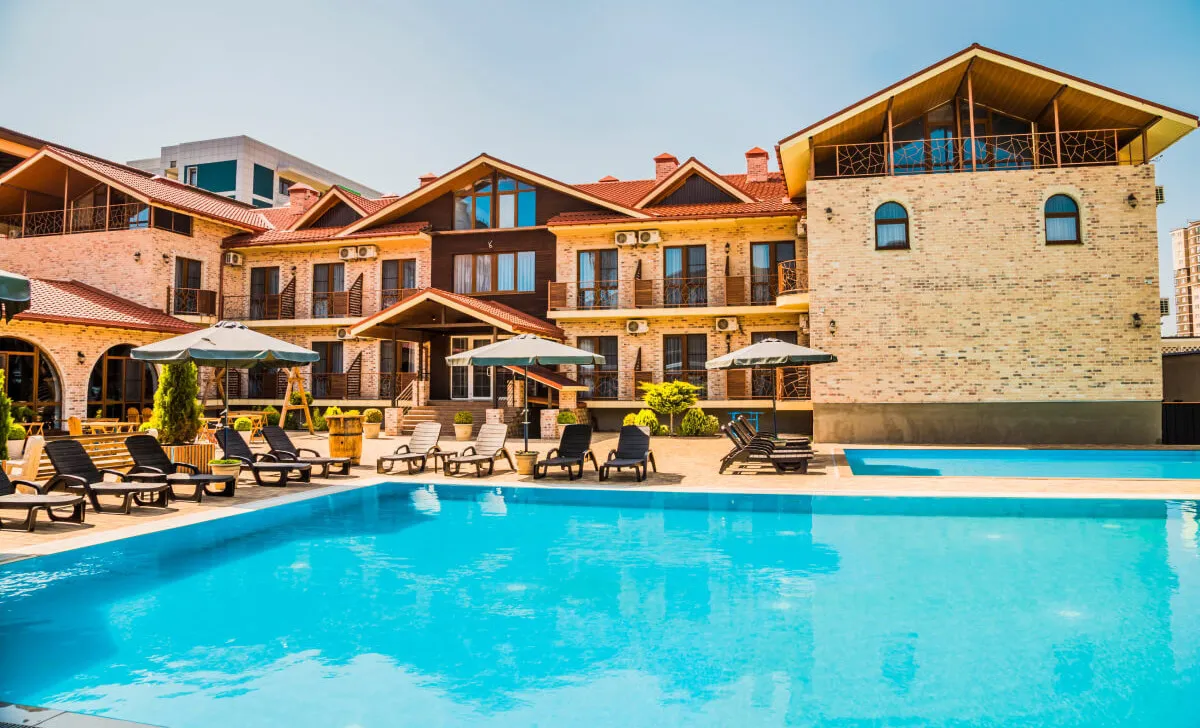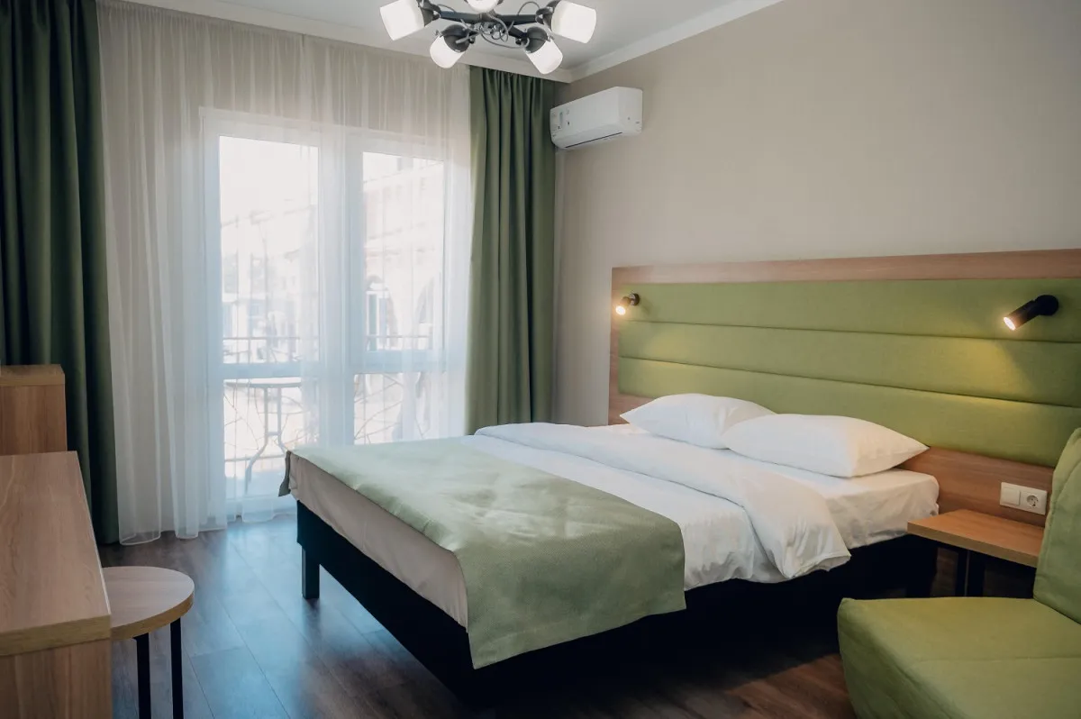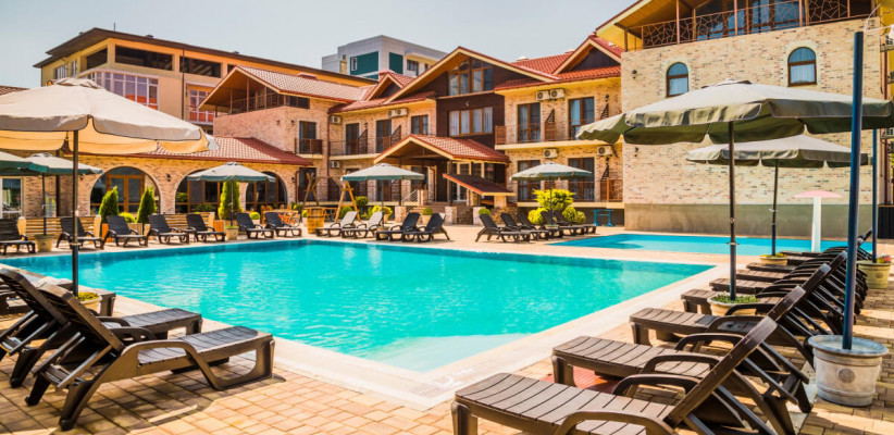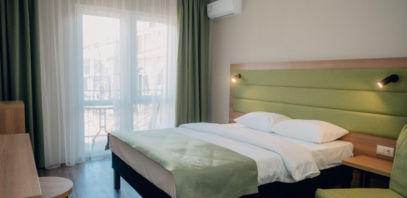 Двухэтажный корпус с внутренним двориком расположен на благоустроенной озелененной территории, создающей уютную атмосферу. Отель ориентирован на семейный отдых: гостям доступны бассейны, детская инфраструктура, а также разнообразные зоны для отдыха и развлечений.