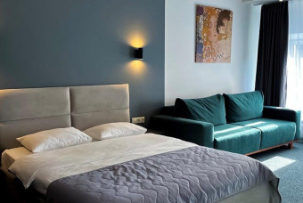 Номер «Люкс» площадью 50 кв.м., максимальное размещение – 2 взрослых + 1 ребенок. Возможно предоставление дополнительного спального места. Спальня, гостиная. В номере есть ванная комната, кондиционер, телевизор, телефон, холодильник, фен, зона отдыха, рабочая зона. Предоставляются халаты и тапочки, косметические средства.