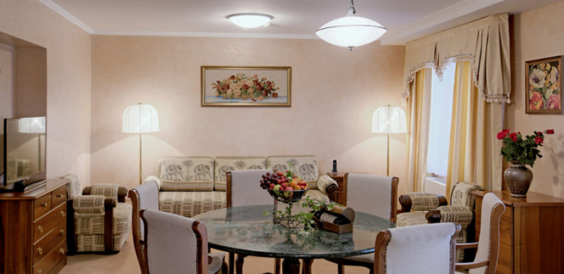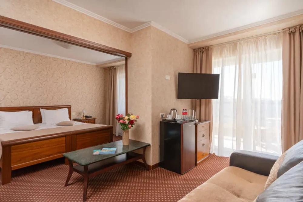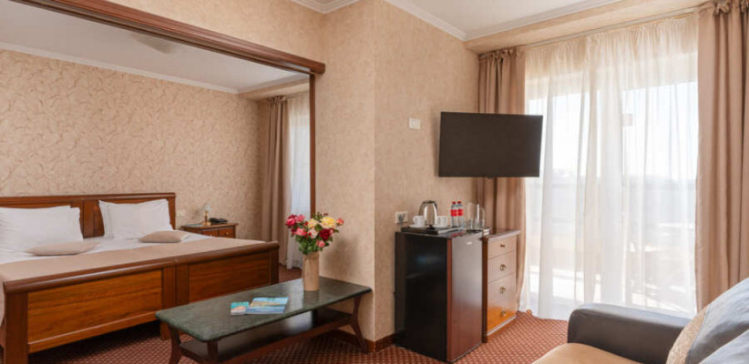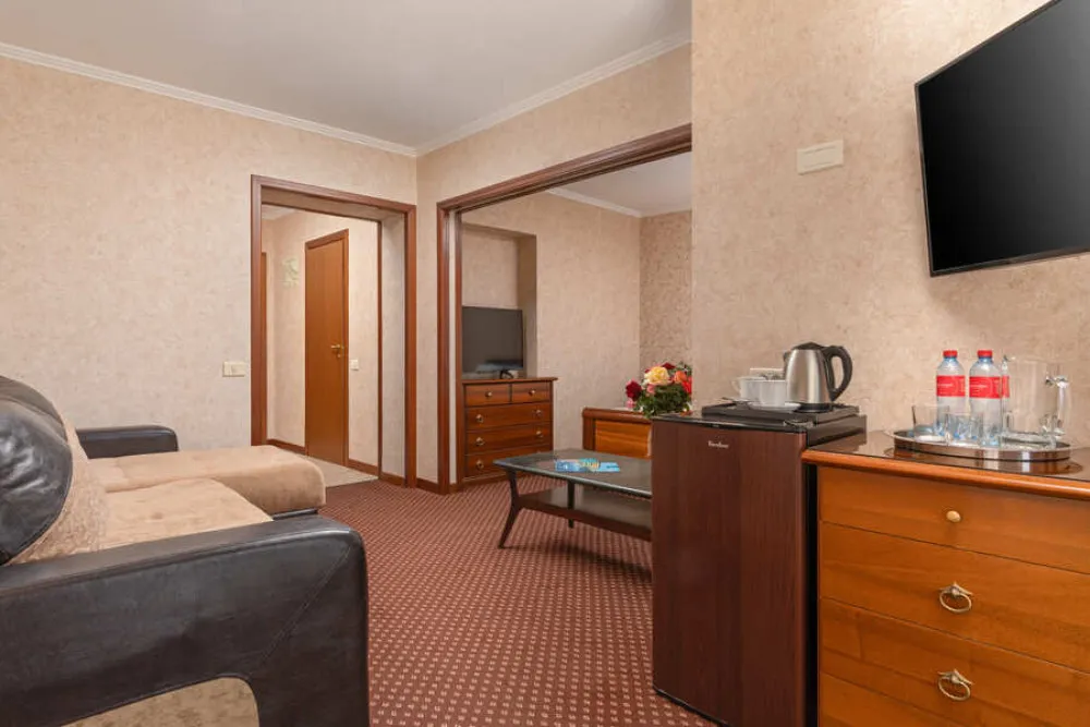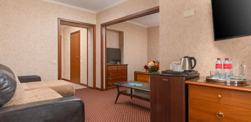 39 м2, в гостиной раскладной мягкий диван. В спальне, отделённой от гостиной дверью-купе – большая двуспальная кровать или две отдельные кровати с анатомическими матрасами. В номере есть лоджия. Количество гостей: до 4Люкс семейный 2-комнатный улучшенный