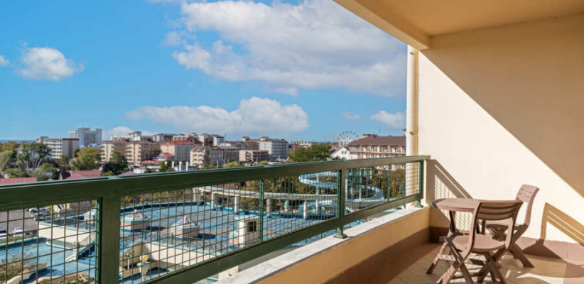 62 м2, в спальне – большая двуспальная кровать с анатомическим матрасом, можно организовать 2 дополнительных спальных места, мини-кухня, гостиная и обеденная зона на шесть персон, балкон. Количество гостей: до 4
