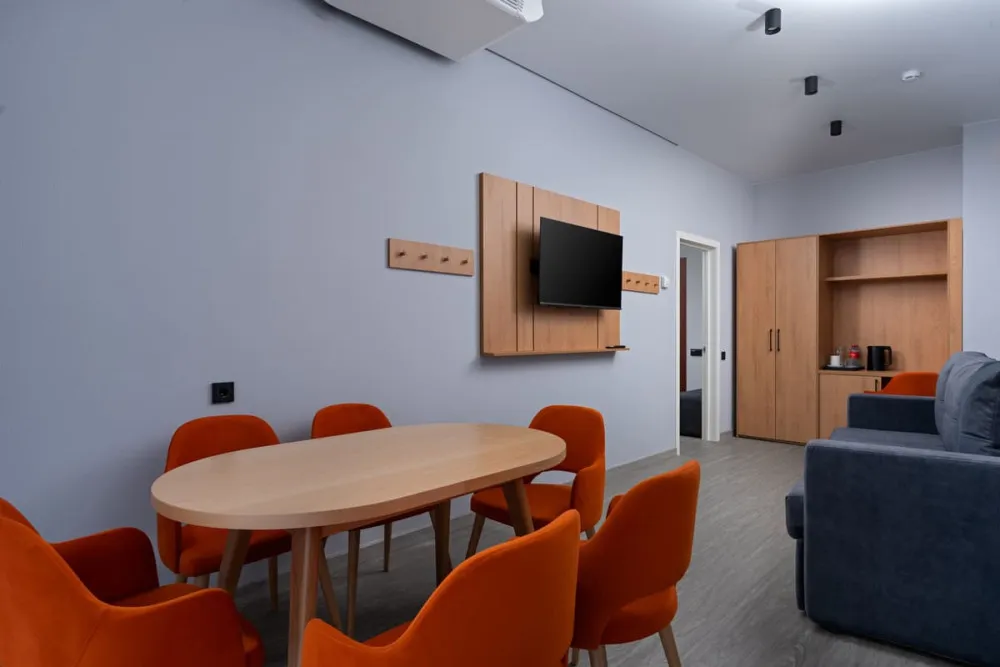 25-29 м2, спальня с большой двуспальной или двумя отдельными кроватями и анатомическими матрасами, гостиная с раскладным диваном. Количество гостей: до 3Апартаменты семейные 2-комнатные