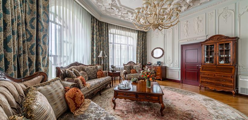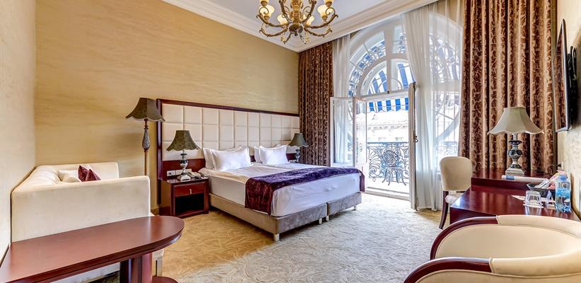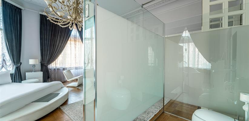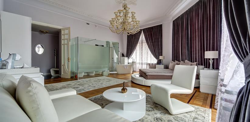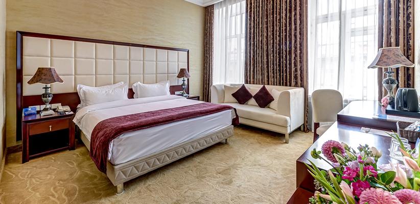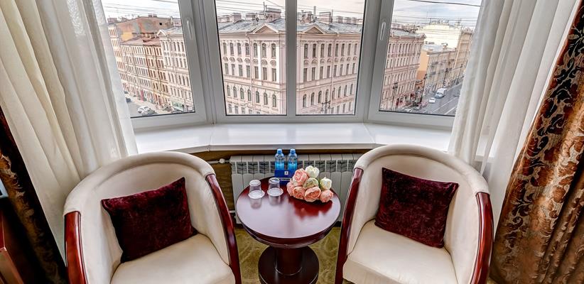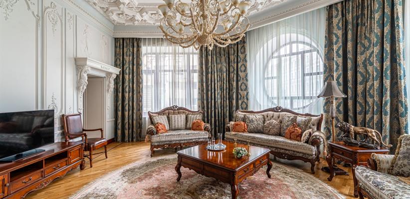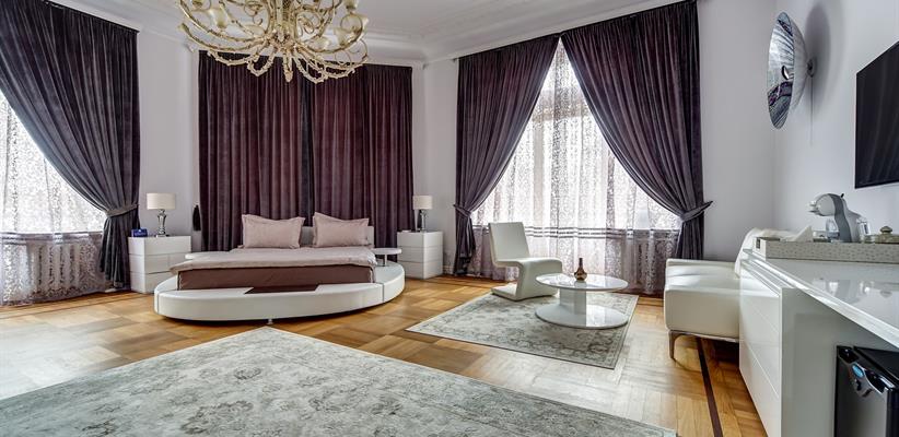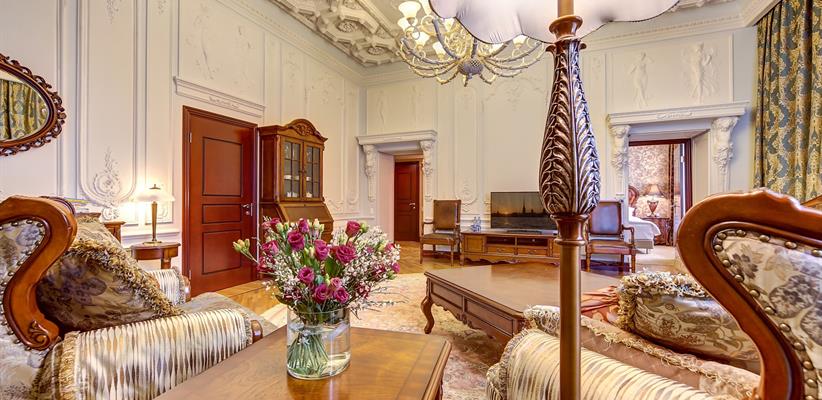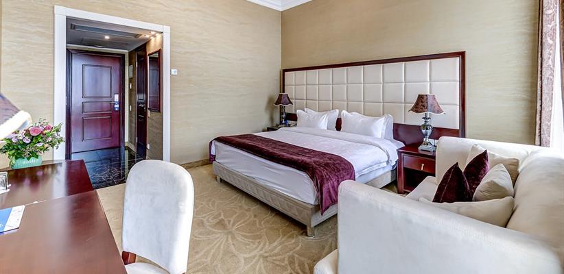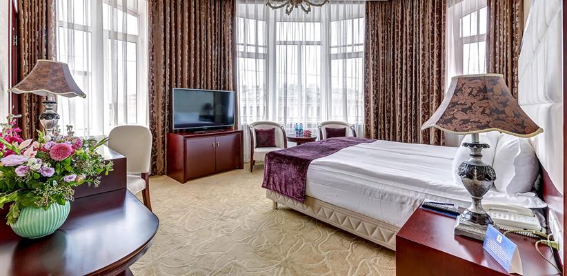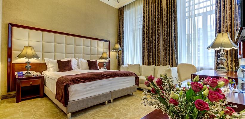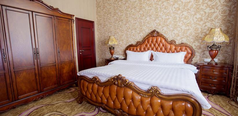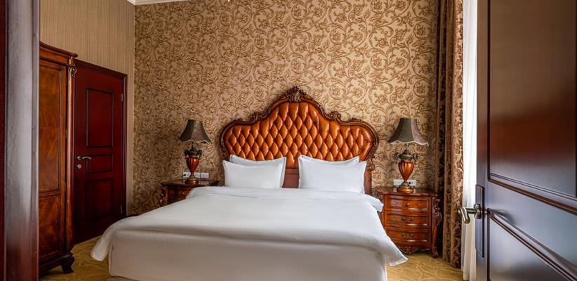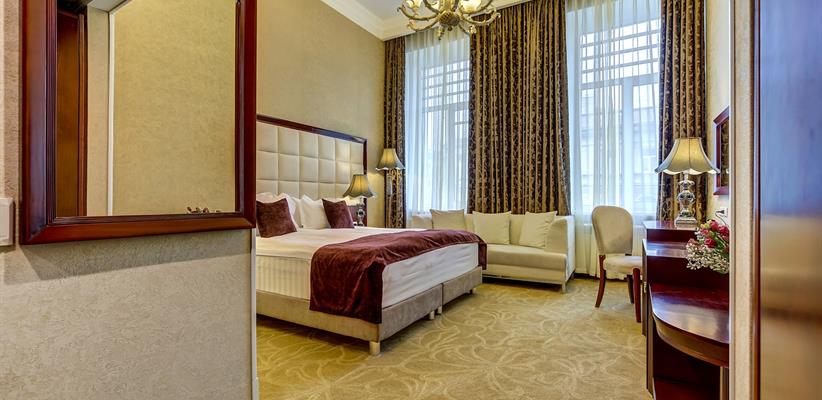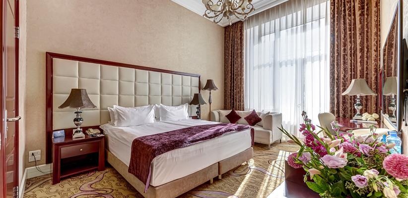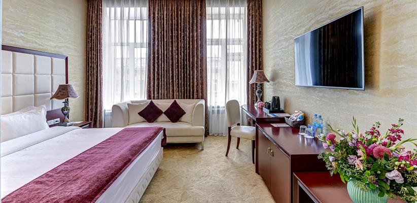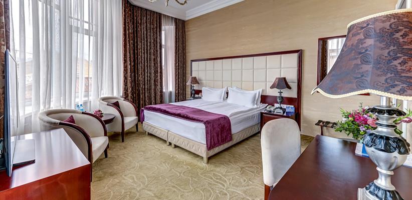 Представительский Люкс площадью 60 кв. м., в номере мебель в стиле модерн, паркет, стеклопакеты с шумоизоляцией, ванная комната с душевой кабинкой, гостевая уборная, кровать размером 180*200 см, кондиционер, ТВ, сейф, предоставляются халат и тапочки, по запросу есть гладильная доска, утюг. В номере есть кофемашина и чайная станция.