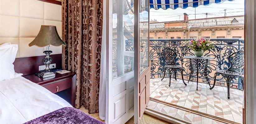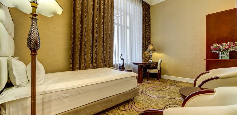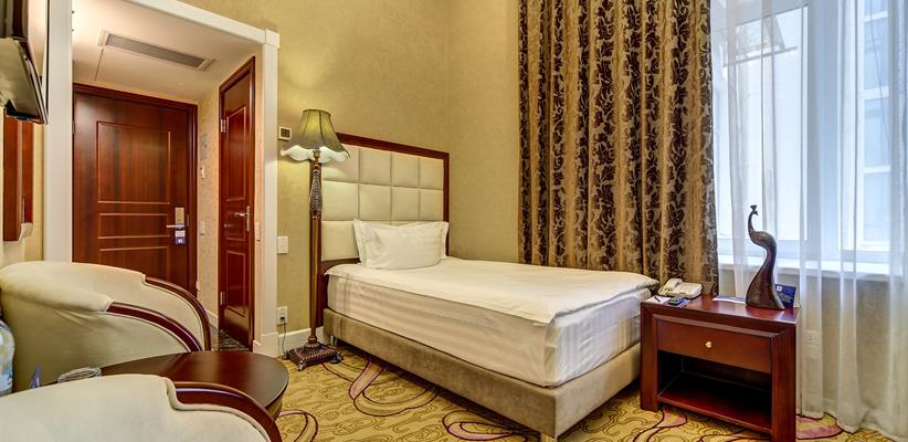 Стандарт одноместный площадью 12 кв. м., номер оборудован стеклопакетами с шумоизоляцией, ванная комната с душевой кабинкой, кровать размером 120*200 см, кондиционер, ТВ, сейф, предоставляются халат и тапочки, по запросу есть гладильная доска, утюг, электрический чайник.