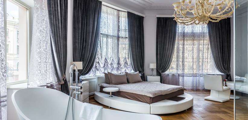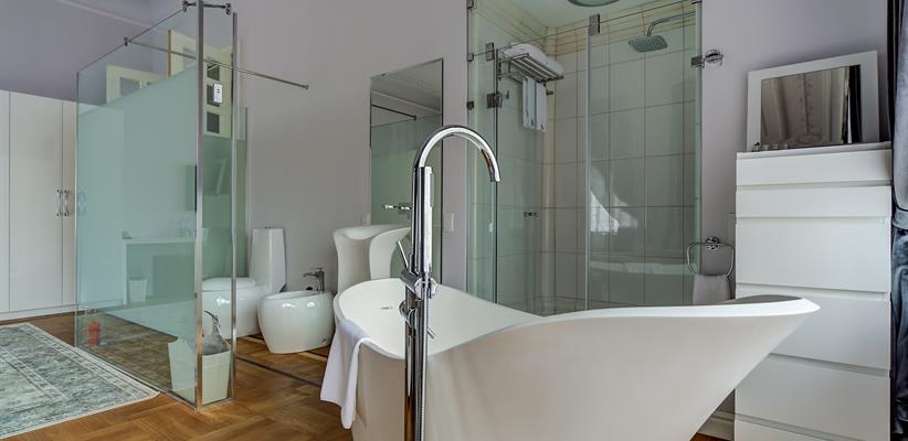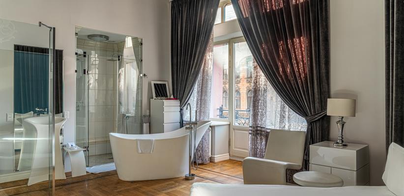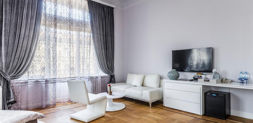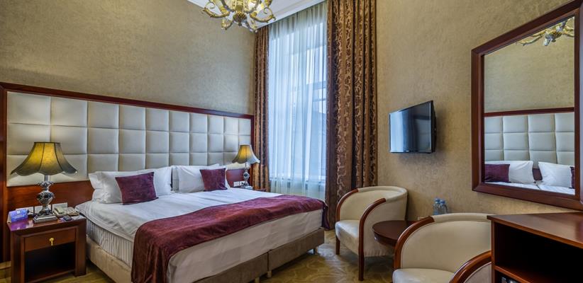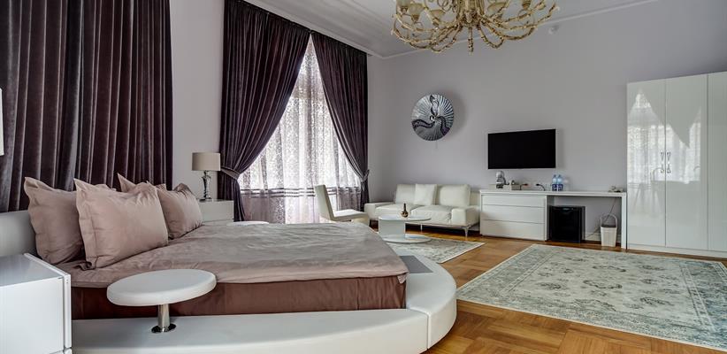 Белый Люкс с террасой площадью 45 кв. м., имеет вид на старый город, ванная находится непосредственно в номере, круглая кровать 180*200, ванная комната с душем, чайная станция, кофемашина, номер оборудован стеклопакетами с шумоизоляцией, кондиционер, ТВ, сейф, предоставляются халат и тапочки, по запросу есть гладильная доска, утюг.