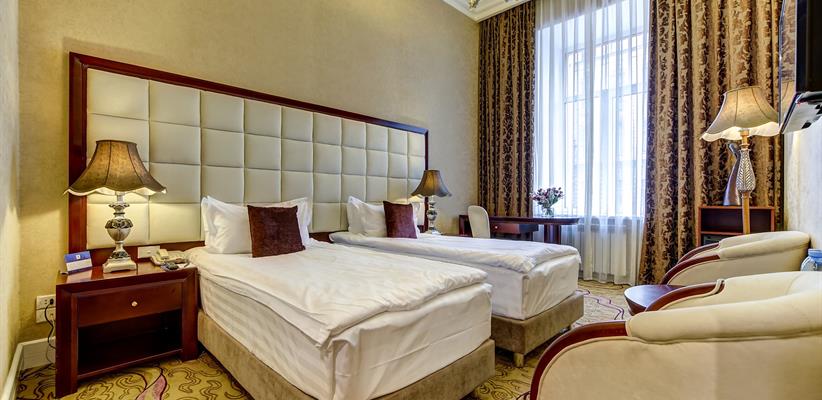 Стандарт двухместный средняя площадь 16 кв. м., номер оборудован стеклопакетами с шумоизоляцией, ванная комната с душевой кабинкой, кровать размером 180*200 см либо две кровати 90*200 см, кондиционер, ТВ, сейф, предоставляются халат и тапочки, по запросу есть гладильная доска, утюг, электрический чайник.