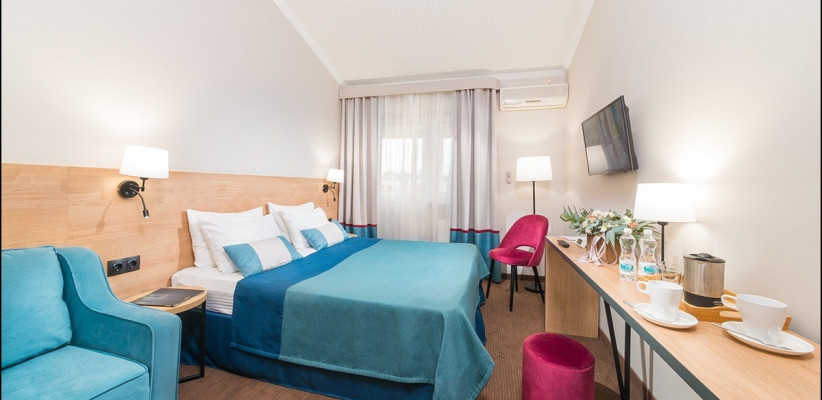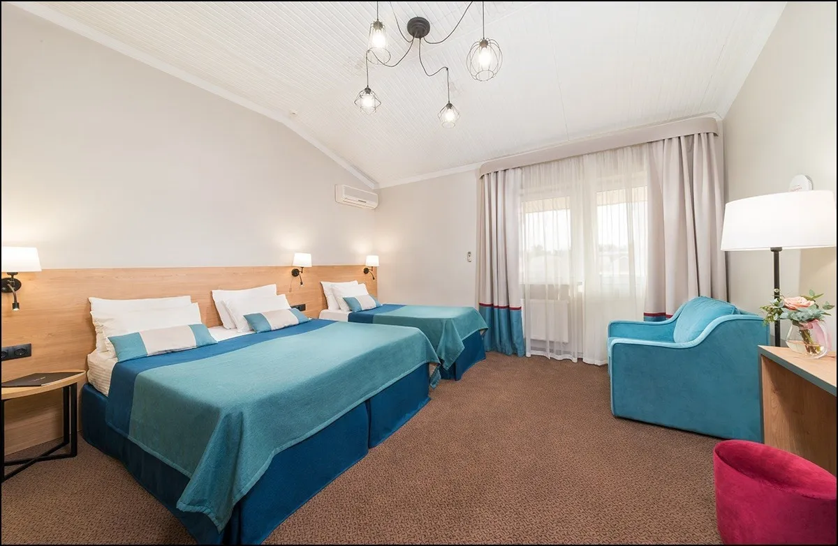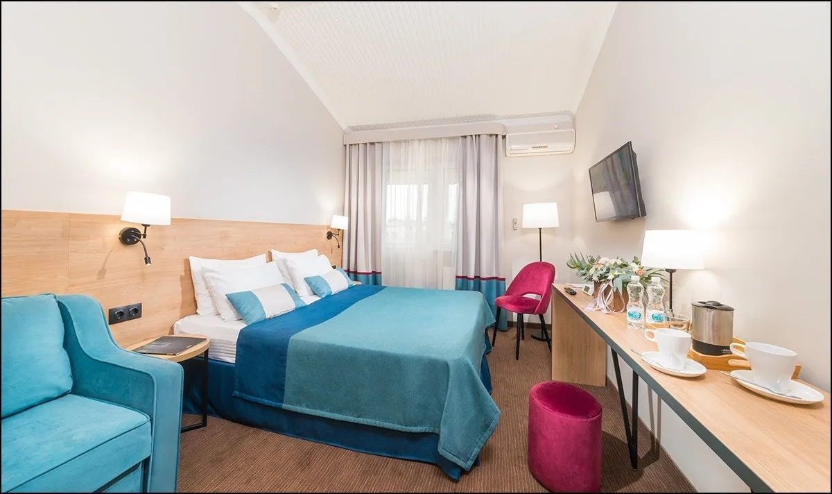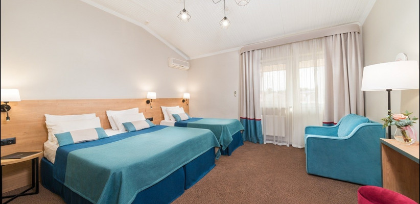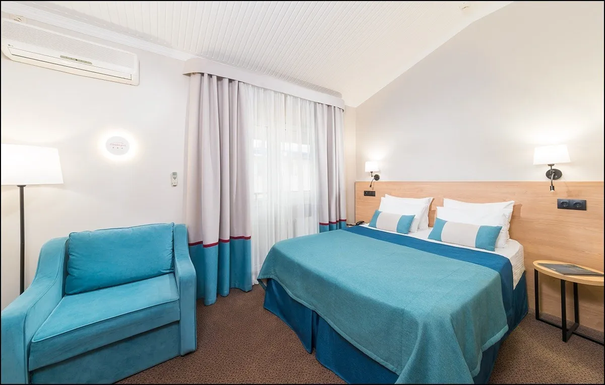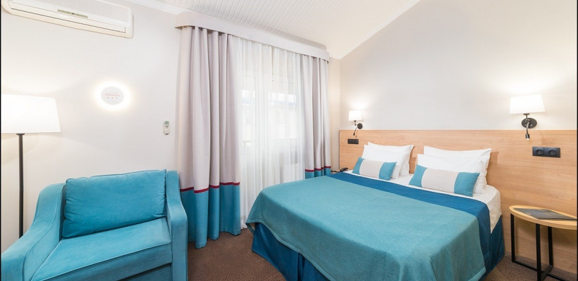 15 м2, с видом на внутренний дворик и бассейн, двуспальная кровать или две односпальные, доп. место. Количество гостей: 3Двухместный стандарт комфорт
