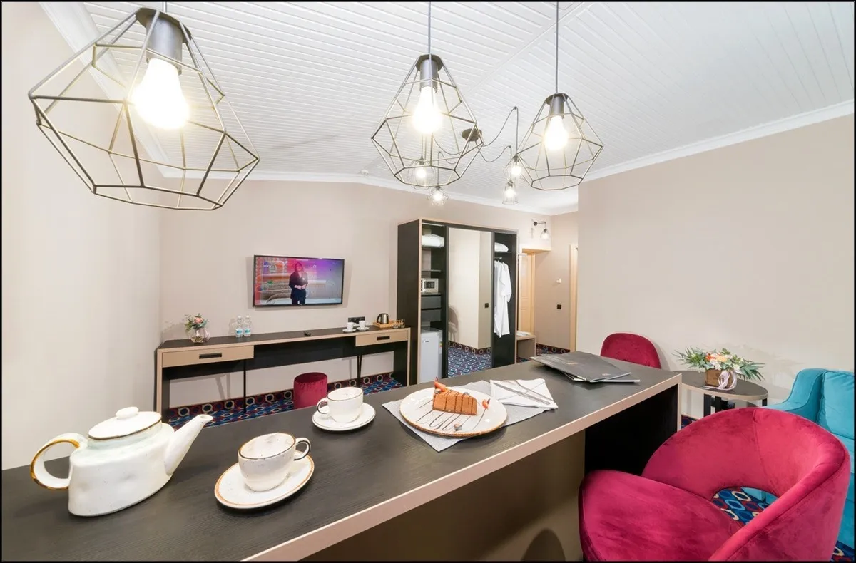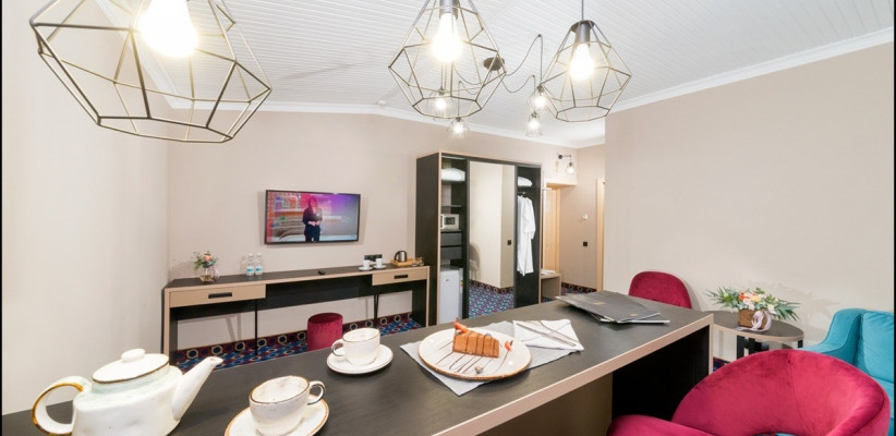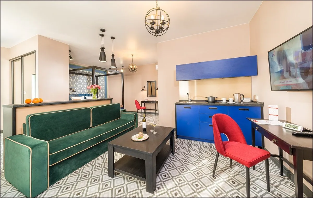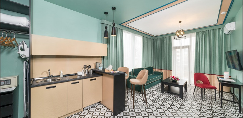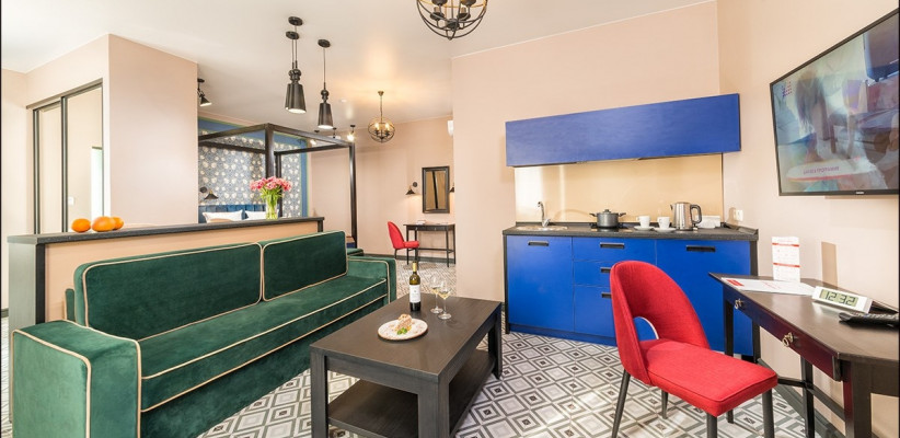30 м2, зона гостиной и спальня, двуспальная кровать, диван-кровать, оборудованный кухонный уголок. Количество гостей: 4Люкс
