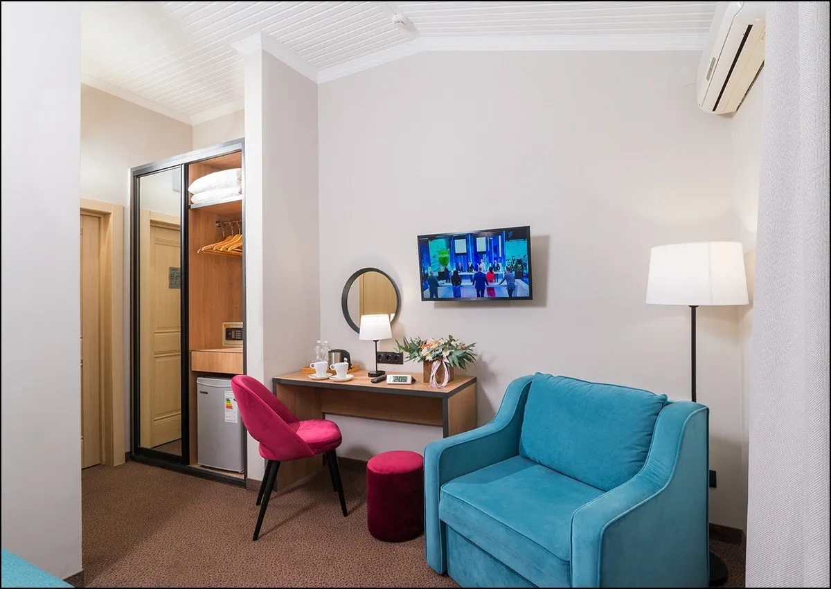17 м2, с видом на центральную пешеходную улицу, двуспальная кровать или две односпальные, доп. место. Количество гостей: 3Двухместный стандарт улучшенный
