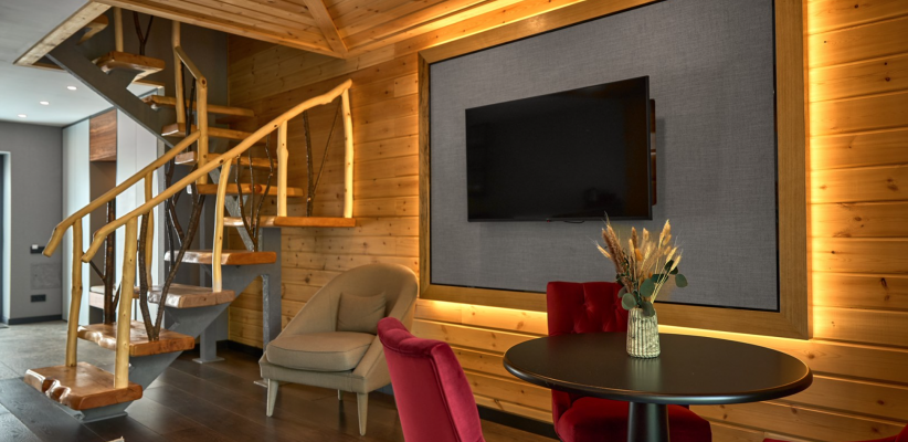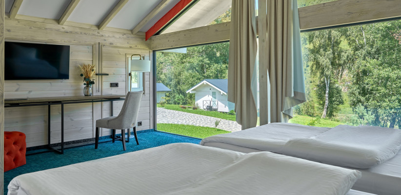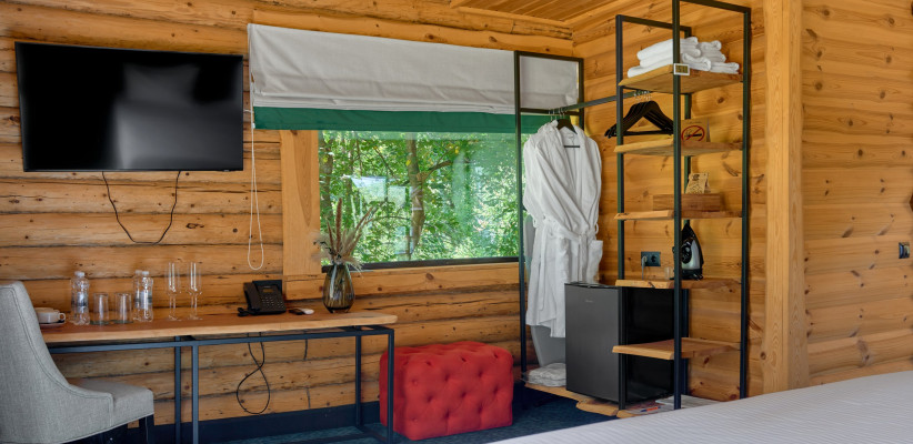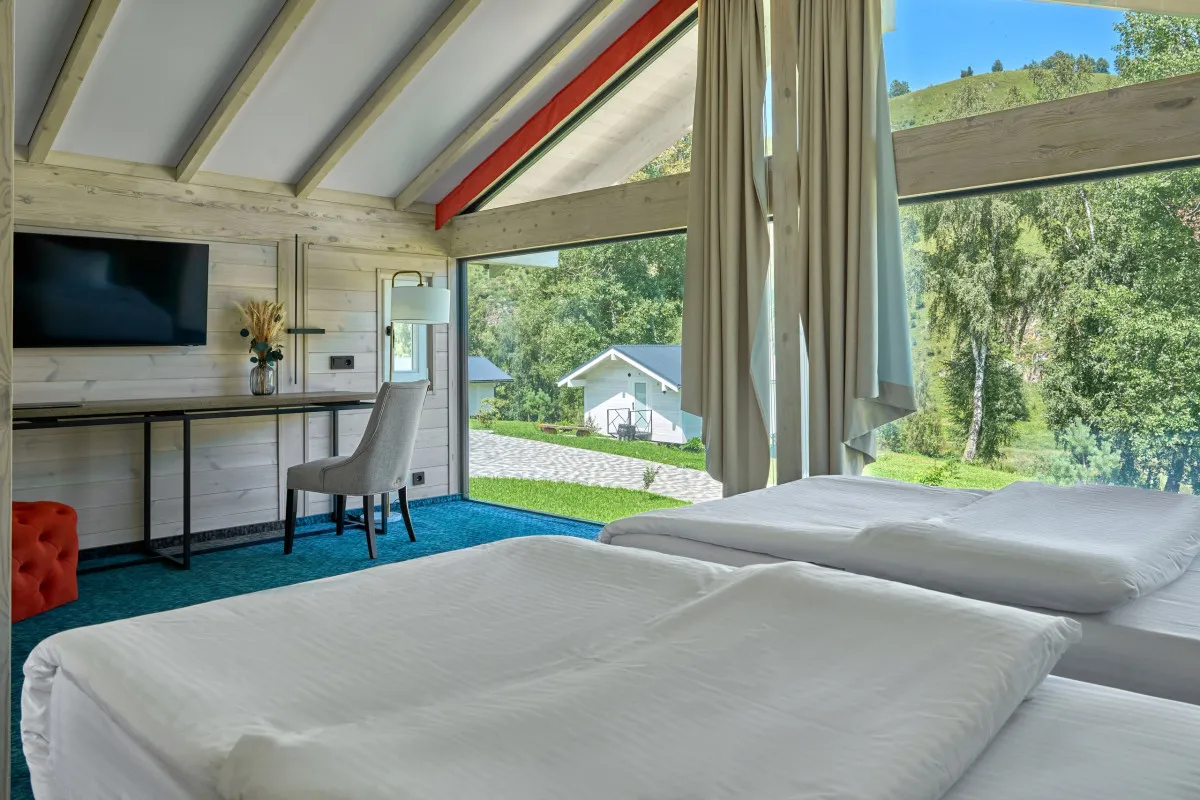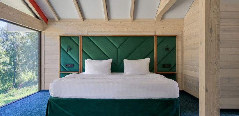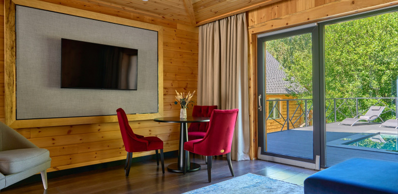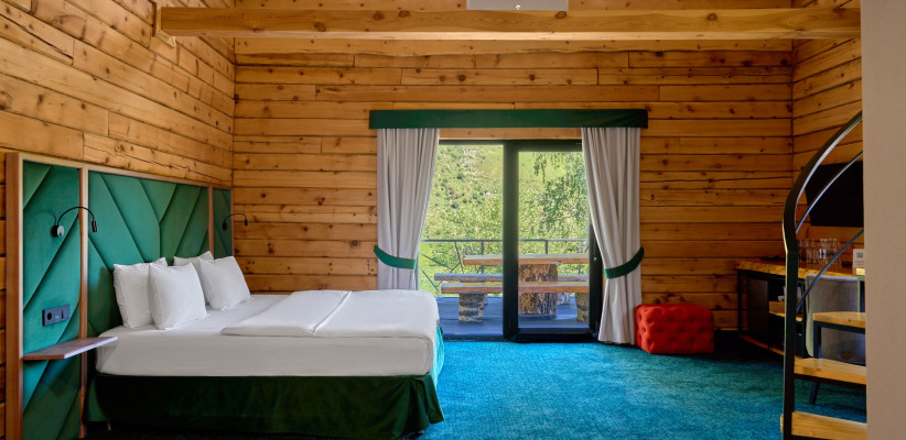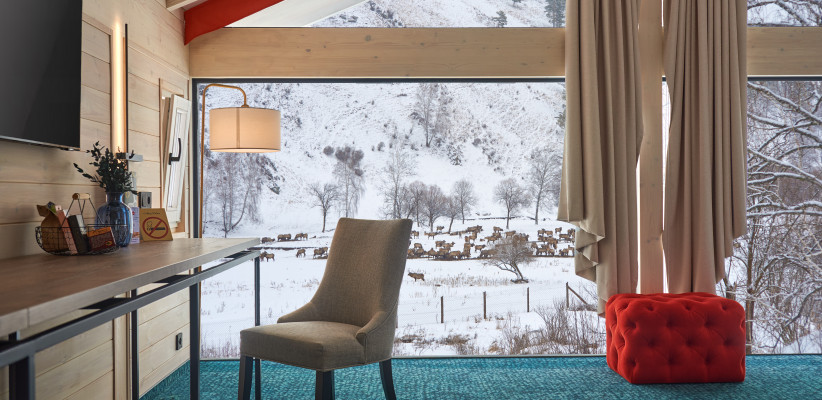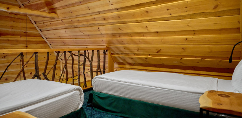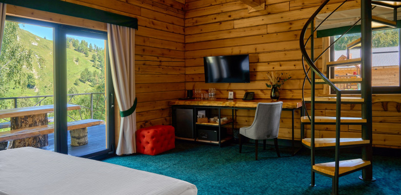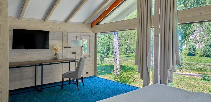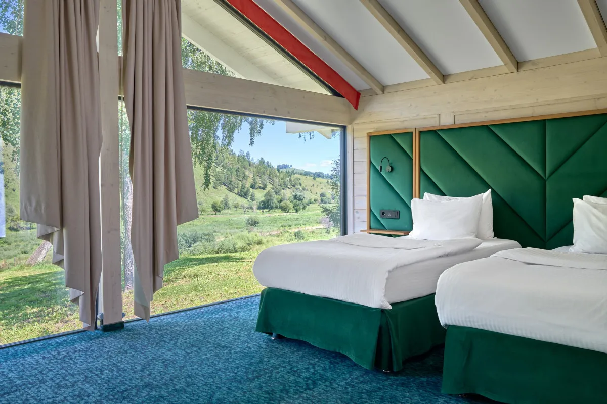 В отеле доступны 26 современных шале, включая виллу-апартаменты с собственным бассейном и панорамными окнами с видом на парк маралов у подножия горы КаимШале c двумя раздельными кроватями 2-я линия