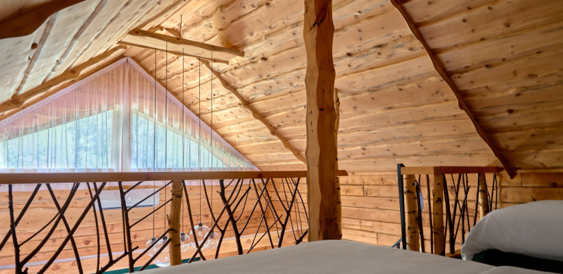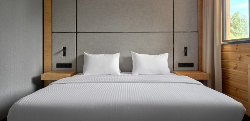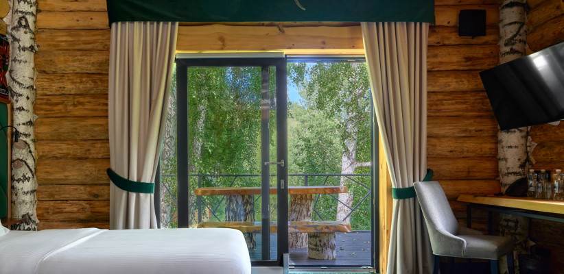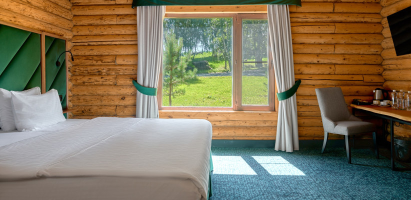 35 м2, две односпальные кровати, панорамный вид на парк маралов и горы Алтая. Количество гостей: 2 + 1 доп. местоШале с двуспальной кроватью 1-я линия