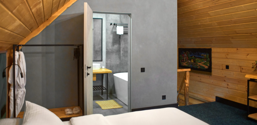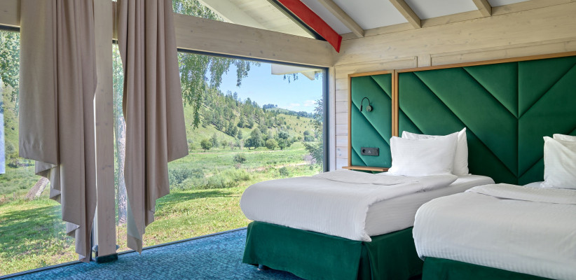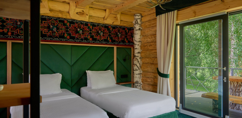 35 м2, две односпальные кровати, панорамный вид на парк маралов и горы Алтая. Количество гостей: 2 + 1 доп. местоШале c двумя раздельными кроватями 1-я линия