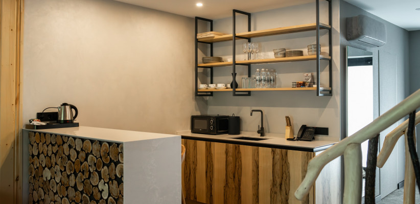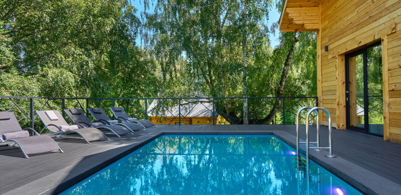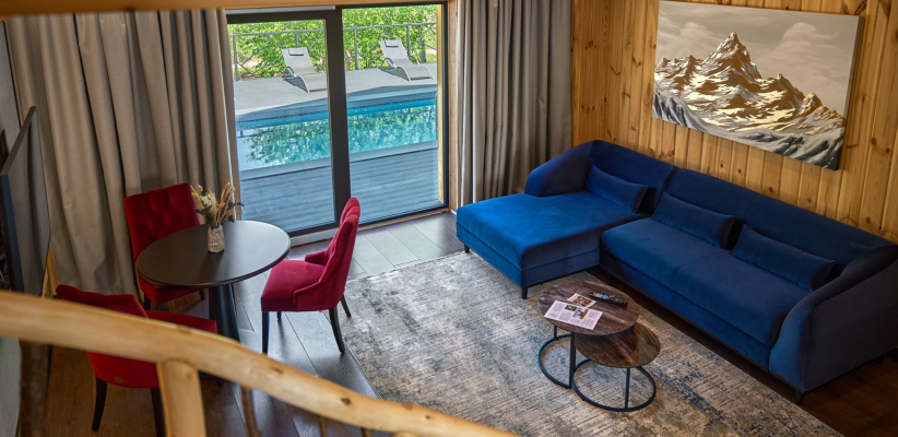90 м2, два этажа, две спальни, две двуспальные кровати размера «king-size», отдельная гостиная, терраса с приватным подогреваемым бассейном и видом на парк маралов. Количество гостей: 4 + 2 доп. места