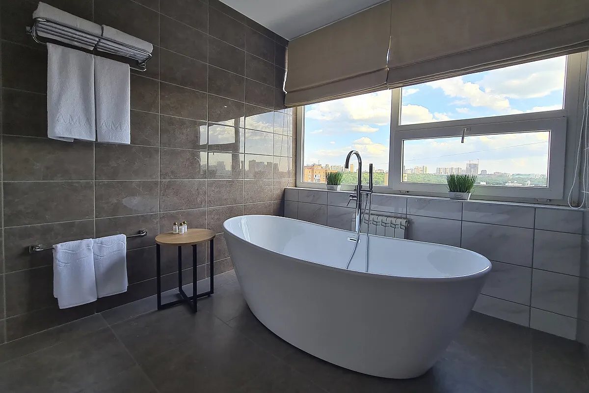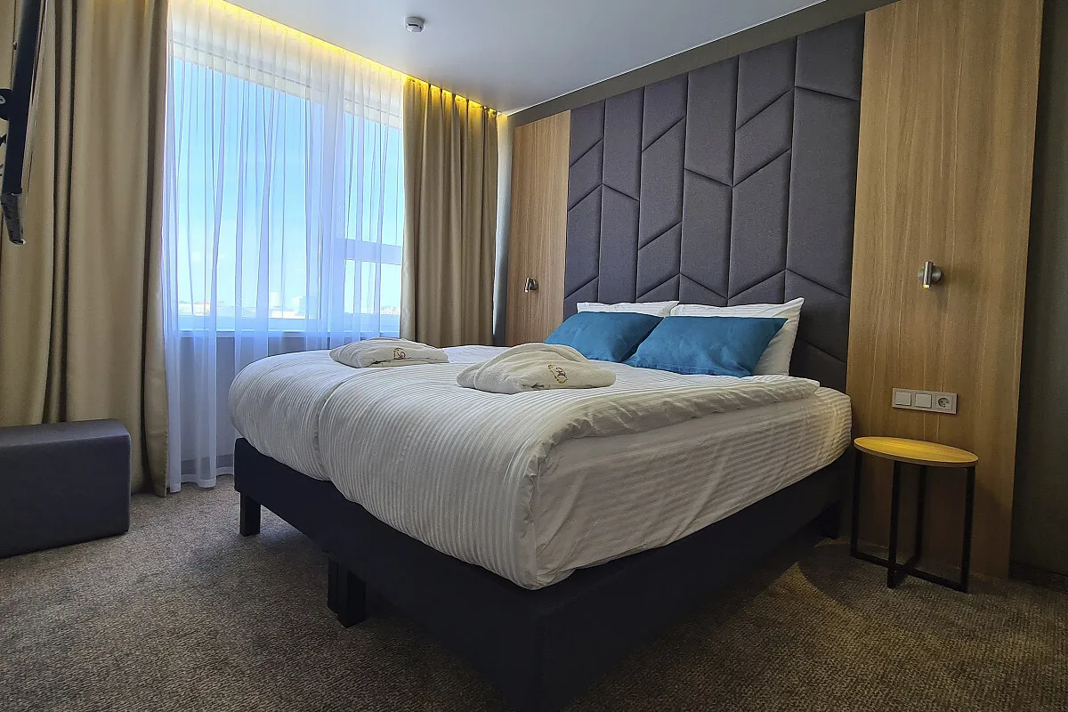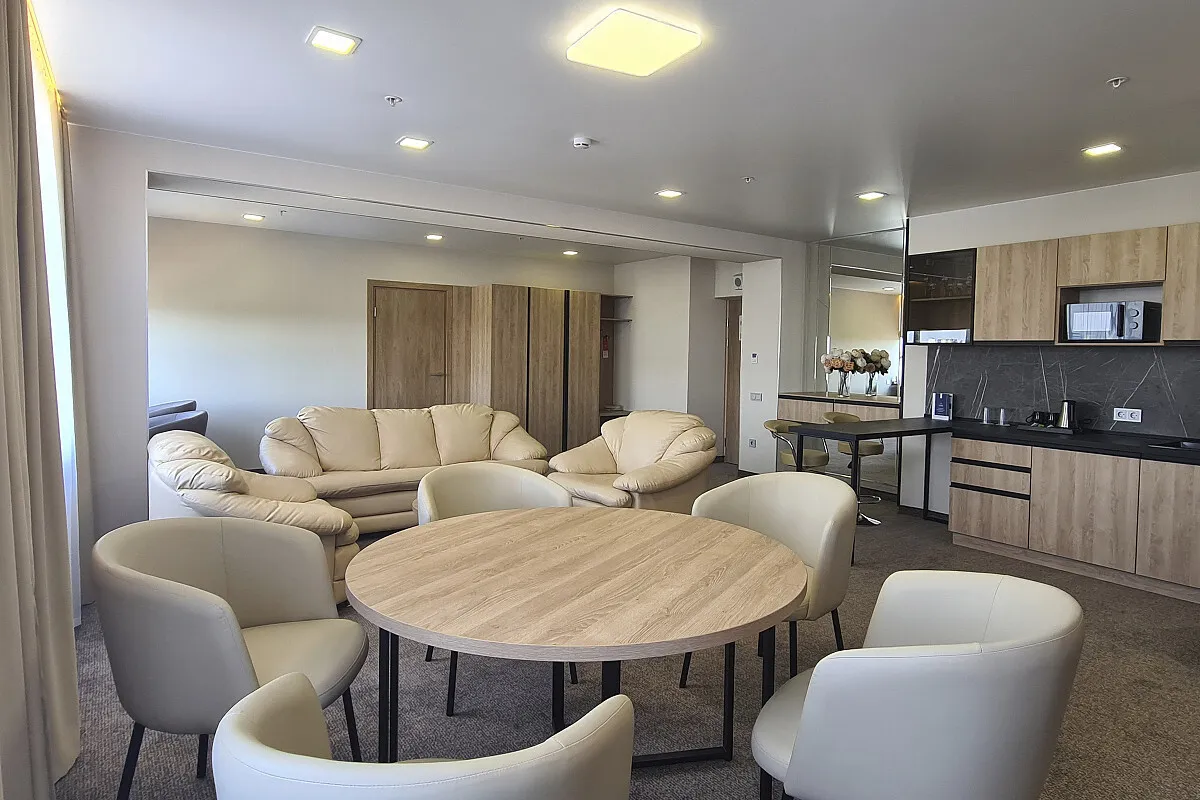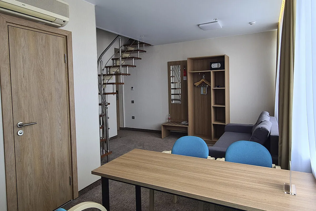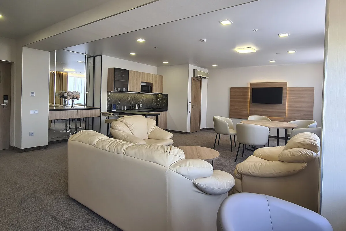 20 м2, две односпальные и двуспальная кровать, диван, рабочая зона. Количество гостей: 3.Люкс