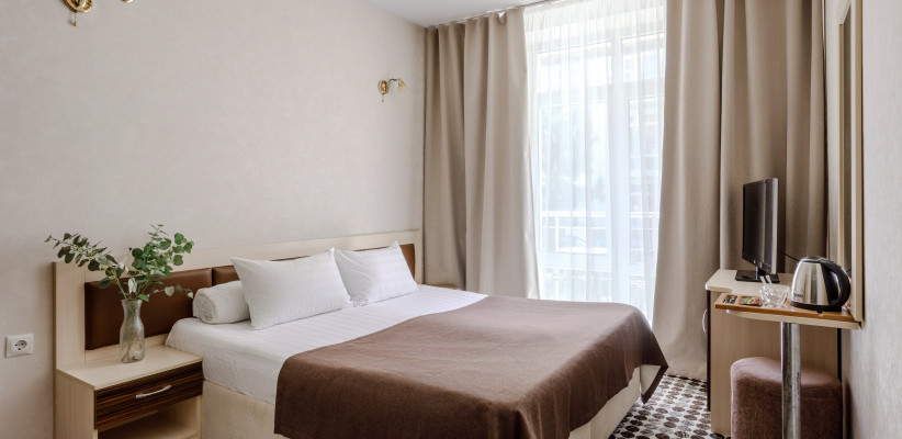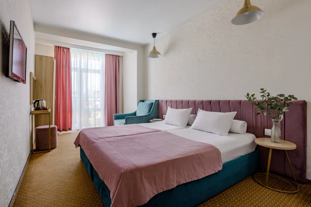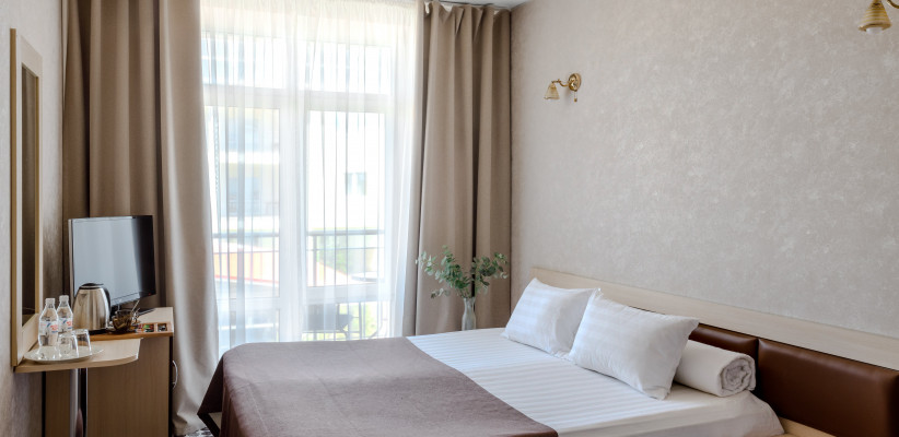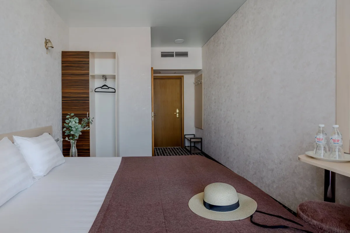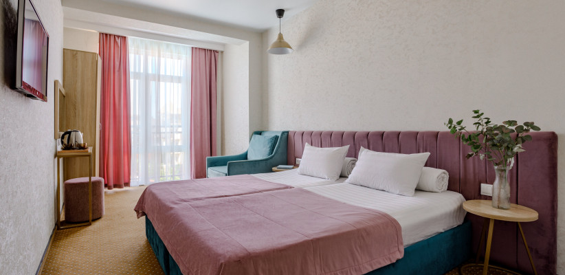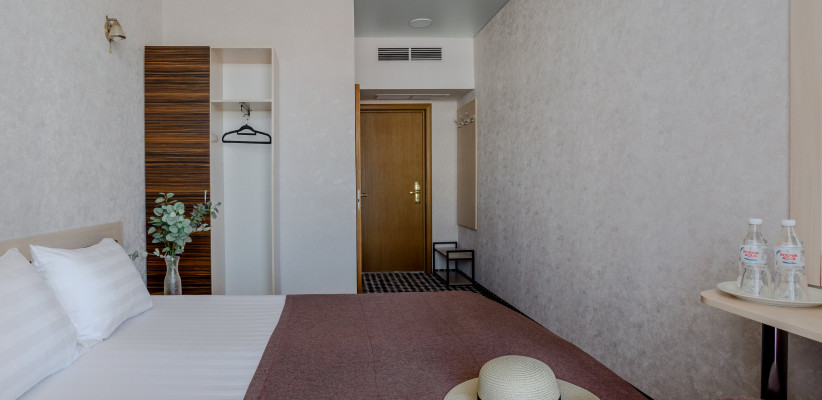 16-20 м2, 1 двуспальная кровать (бокс-спринг) или 2 односпальных кровати (бокс-спринг). Количество гостей: два человека на основных местах и один ребенок до 5 лет включительно без предоставления доп.места2-х местный «Стандарт» с доп.местом