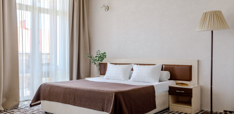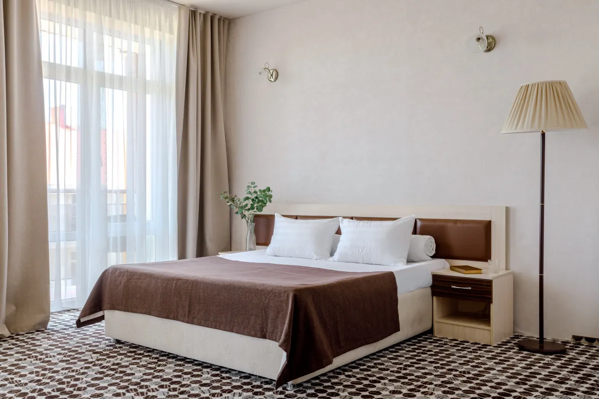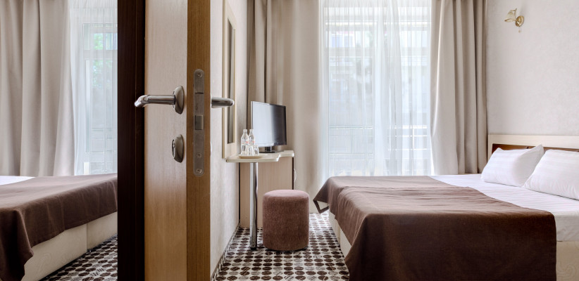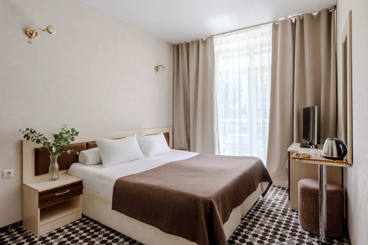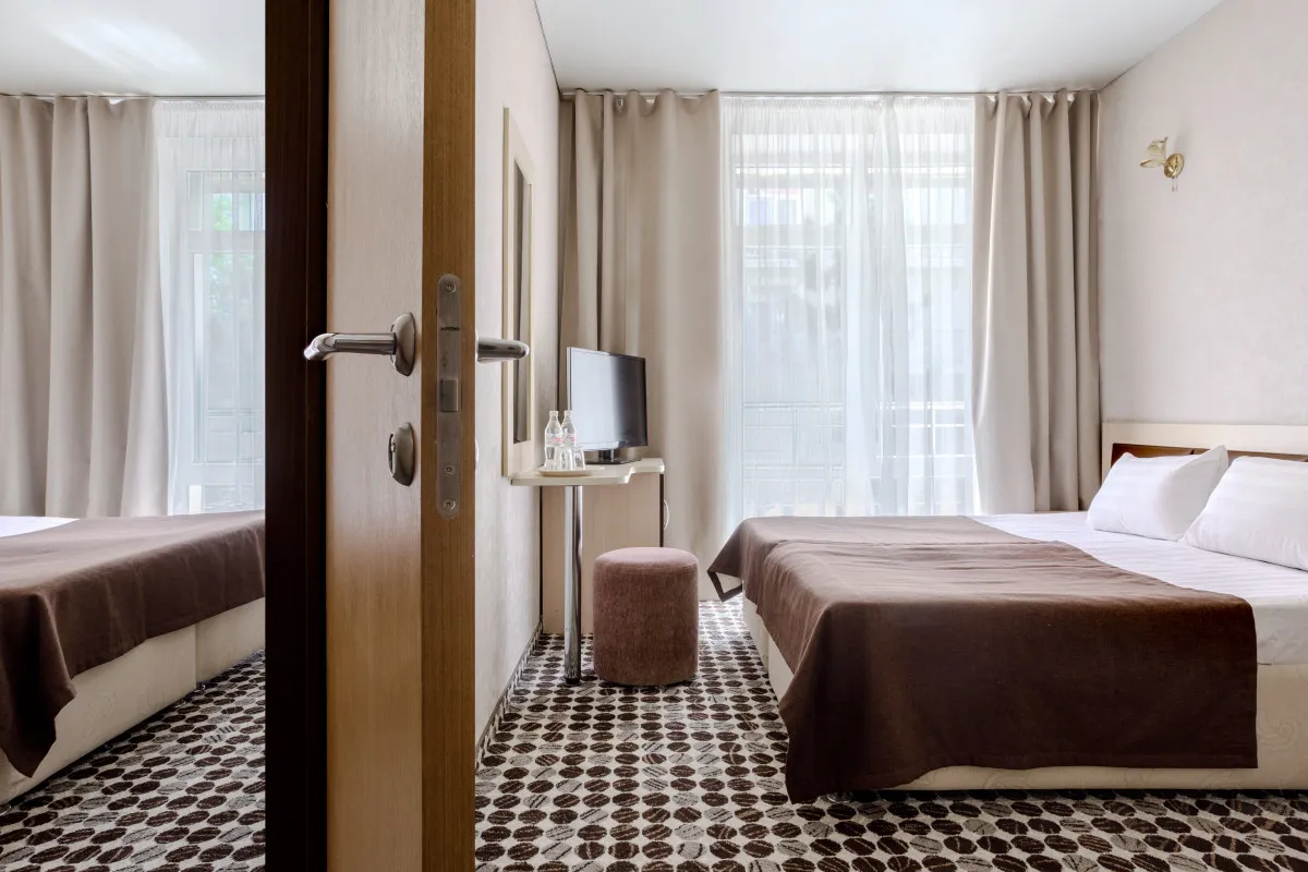 16-20 м2, 1 двуспальная кровать (бокс-спринг) или 2 односпальных кровати (бокс-спринг). Количество гостей: два человека на основных местах и один ребенок до 5 лет включительно без предоставления доп.места2-х местный «Стандарт» с доп.местом