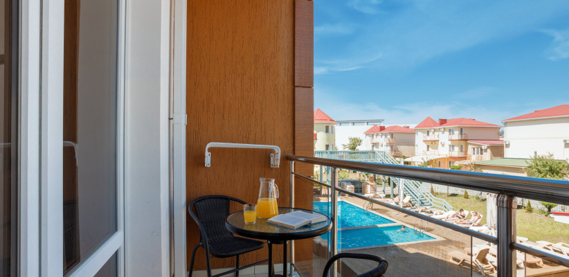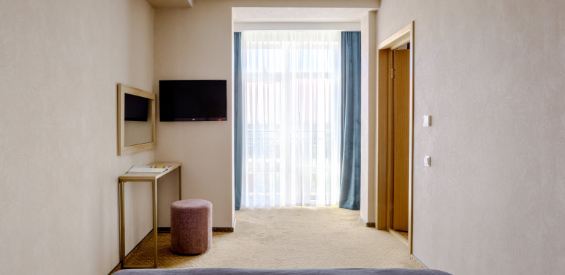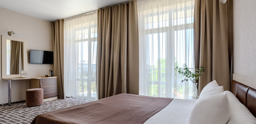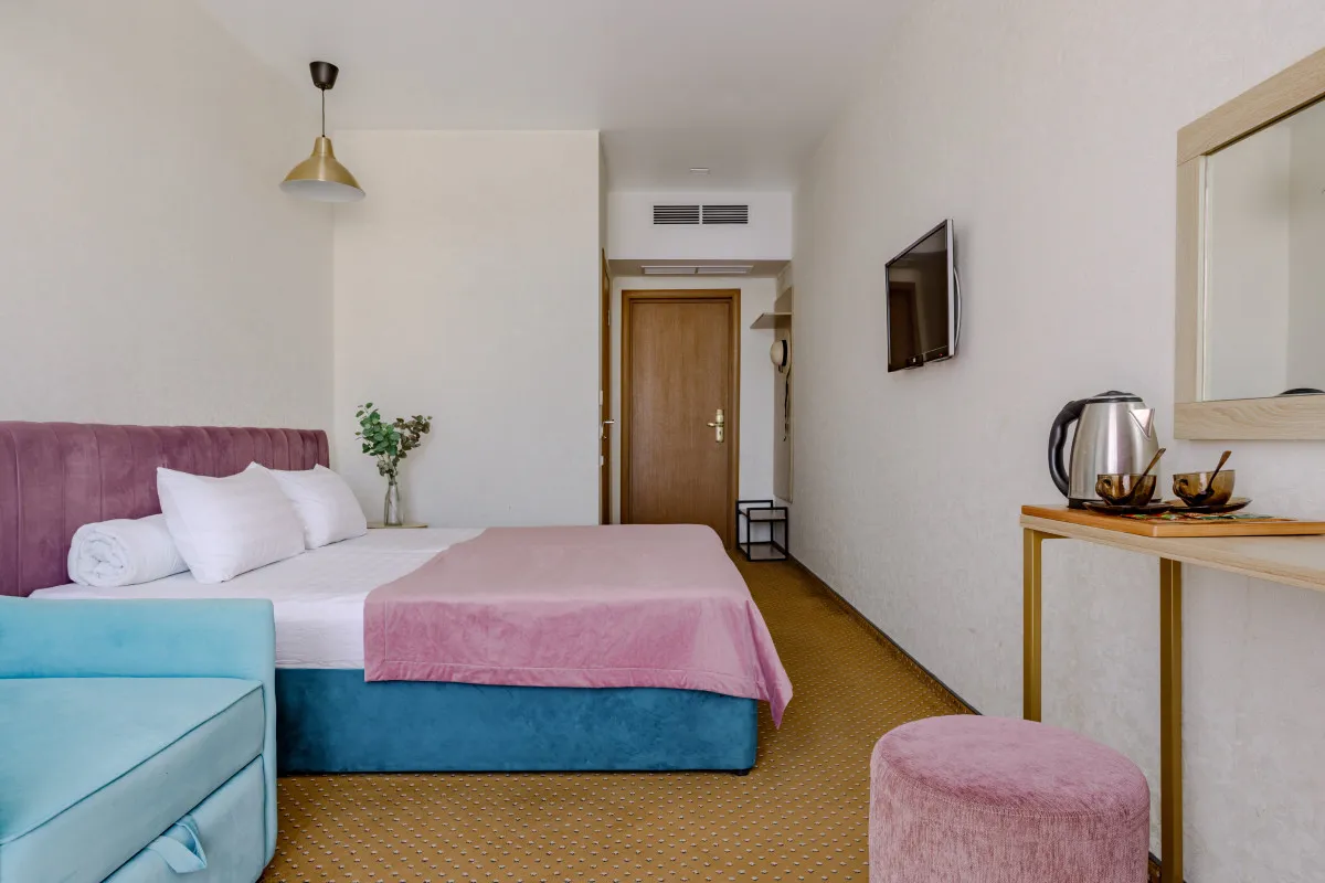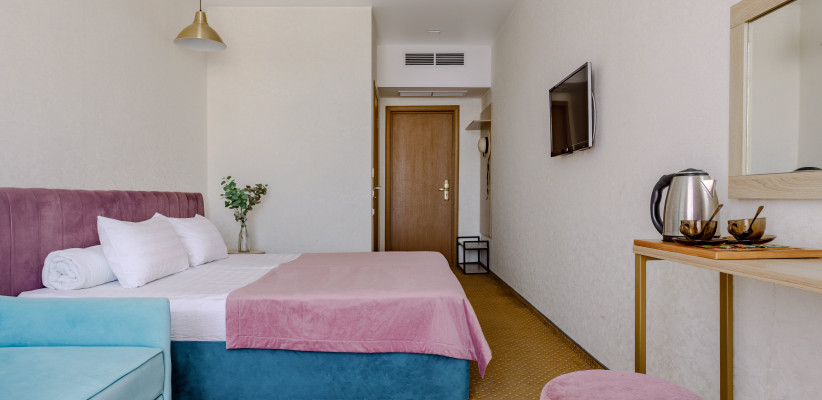 38 м2, 1 двуспальная кровать (бокс-спринг). Количество гостей: два человека на основных местах и два человека на дополнительном месте (диван-кровать). Один ребенок в номере до 5 лет без предоставления места, но с питанием может размещаться бесплатно с питанием4-х местный «Семейный»